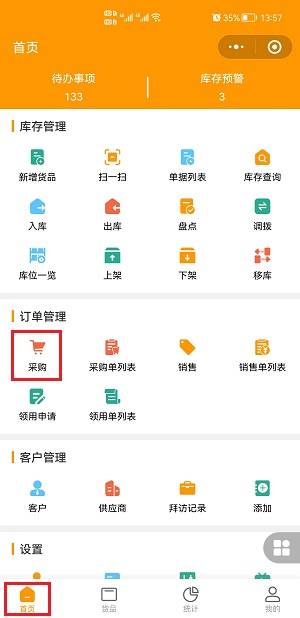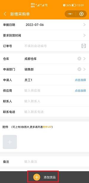 2、单据日期默认当天,订单号可以自定义,不填写则系统自动编号,选择采购货品入库仓库,申请人默认为当前登录账号,补充其他信息后点击【添加货品】。