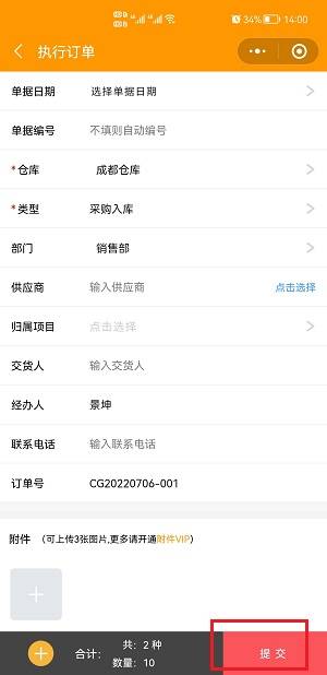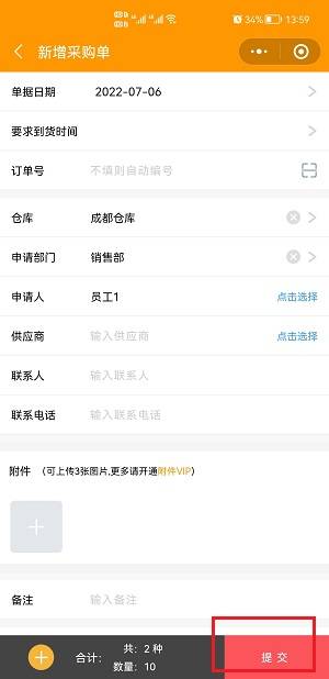 4、确认信息无误后点击【提交】即可成功添加采购订单。