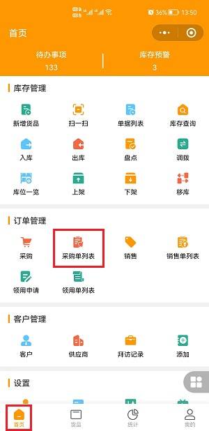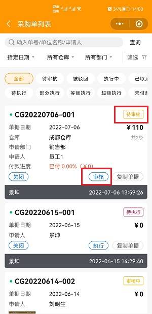 6、找到已提交的采购单,此时订单状态为待审核,点击【审核】完成单据审核流程。