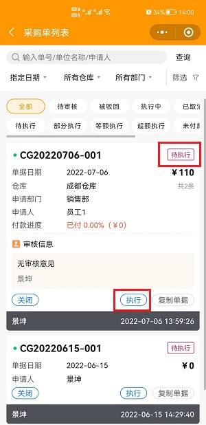 7、订单通过审核后状态变更为待执行,点击【执行】。