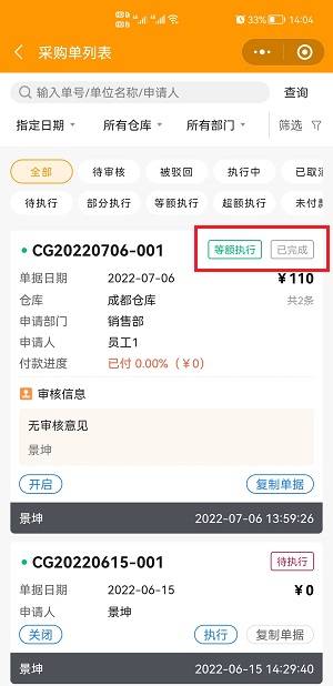 11、若执行数量等于采购单数量,则订单状态变更为【等额执行】【已完成】,订单关闭。