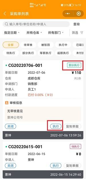 12、若执行数量小于采购单数量,则订单状态变更为【部分执行】,订单可以继续执行,直到采购货品执行完成。