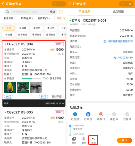第二步,点击需要修改的采购订单进入订单详情页面。并且点击左下角【撤销】按钮撤销订单。