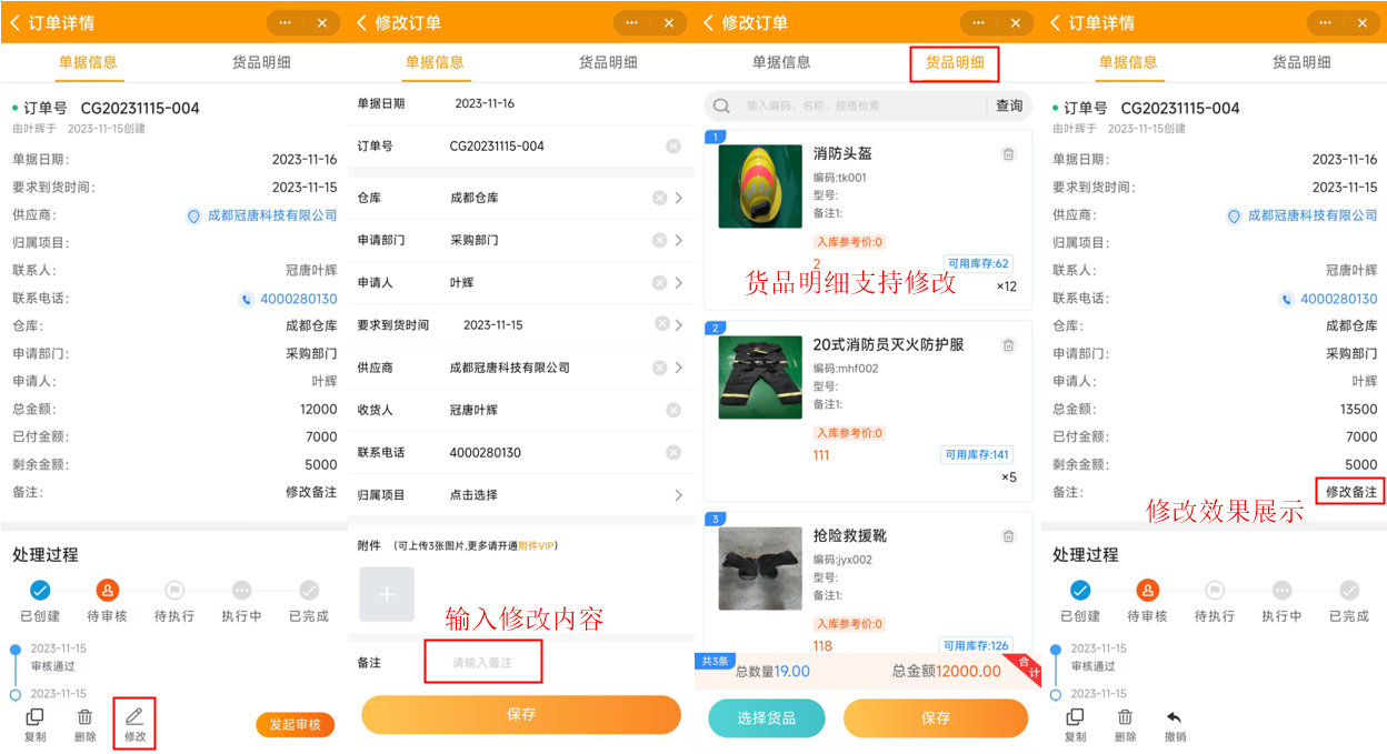 第三步,点击左下角【修改】按钮修改订单,进入订单修改页面,填写修改内容。填写完成后点击【保存】按钮即可完成修改。