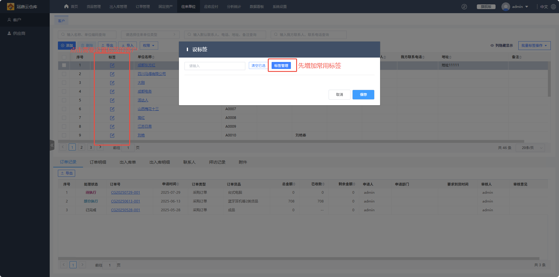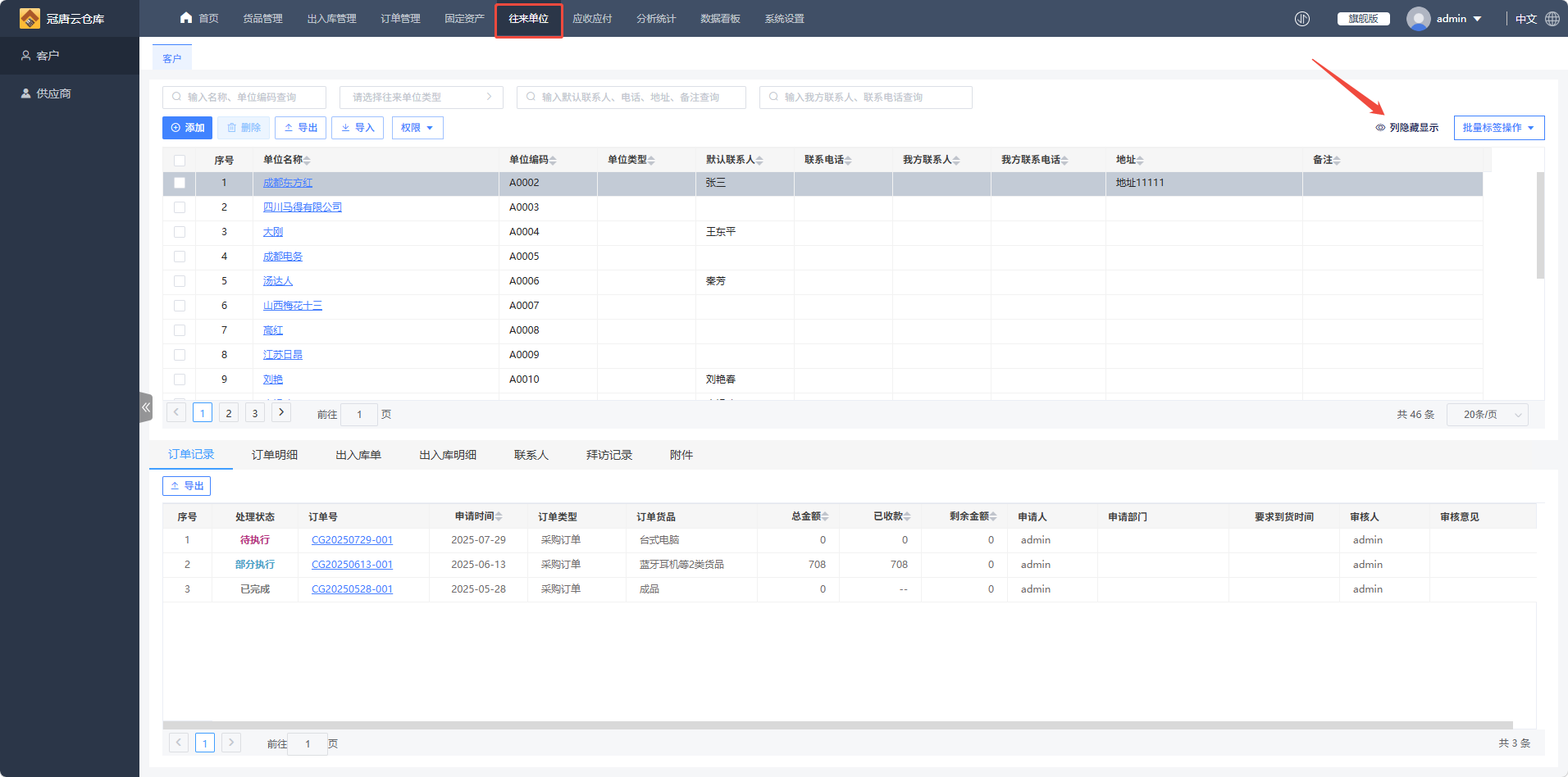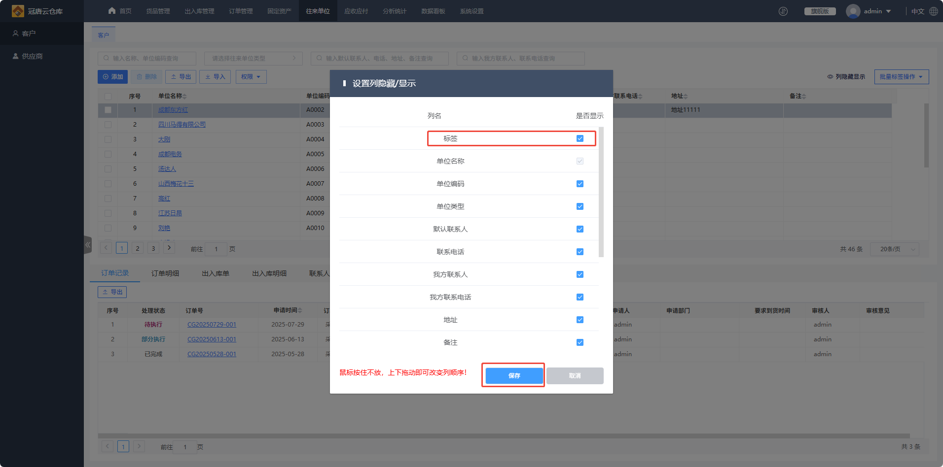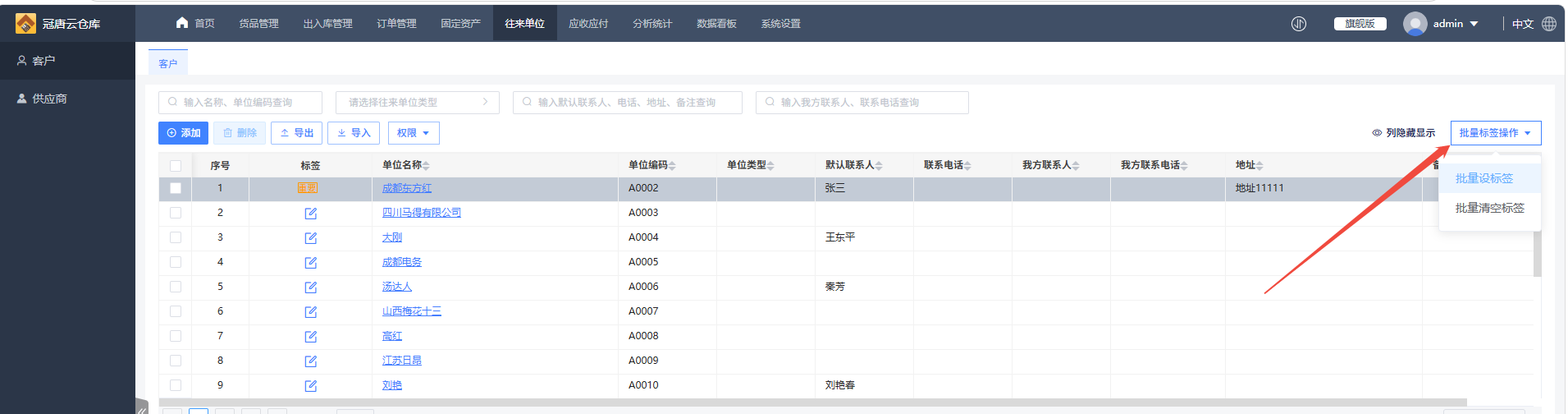 1.进入往来单位模块,这里以给客户设置标签为例,客户列表中默认没有展示出标签列,需要在“列隐藏显示”勾选“标签”