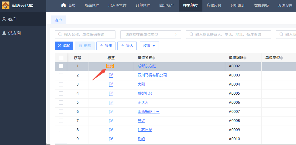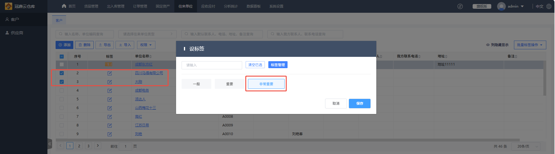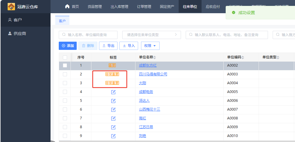 批量设置标签是在往来单位现有标签基础上新增标签,比如这里我勾选了两家单位,批量设置为“非常重要”