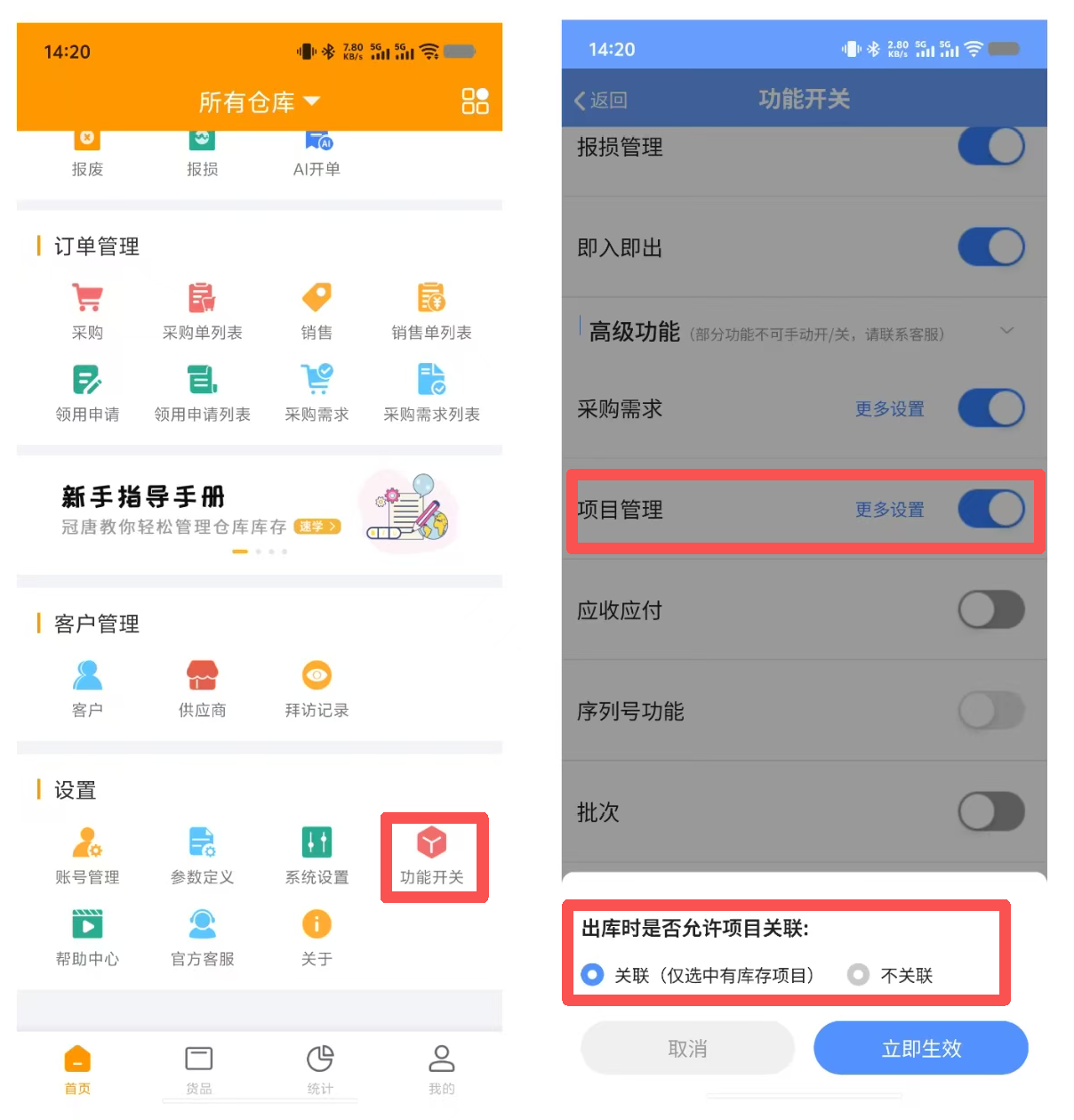 在【首页-功能开关】中找到【项目管理】,可进行功能的开启/关闭,开启后可进行出库时是否允许项目关联的配置,如果选择关联表示在出库时会根据项目库存判断库存是否充足,如果库存不足会根据相应的规则做出提醒。反之,若项目库存不足不会做出提醒,只起到记录关联项目的作用。