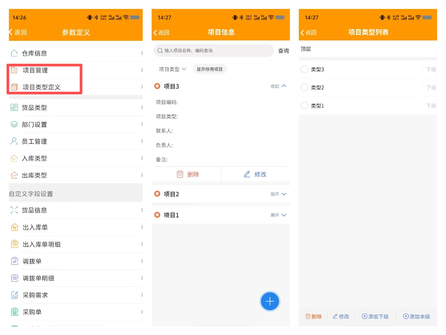 手机端项目管理包括:项目管理功能的开/关及其相关配置、项目和项目类型的定义、单据中项目的使用