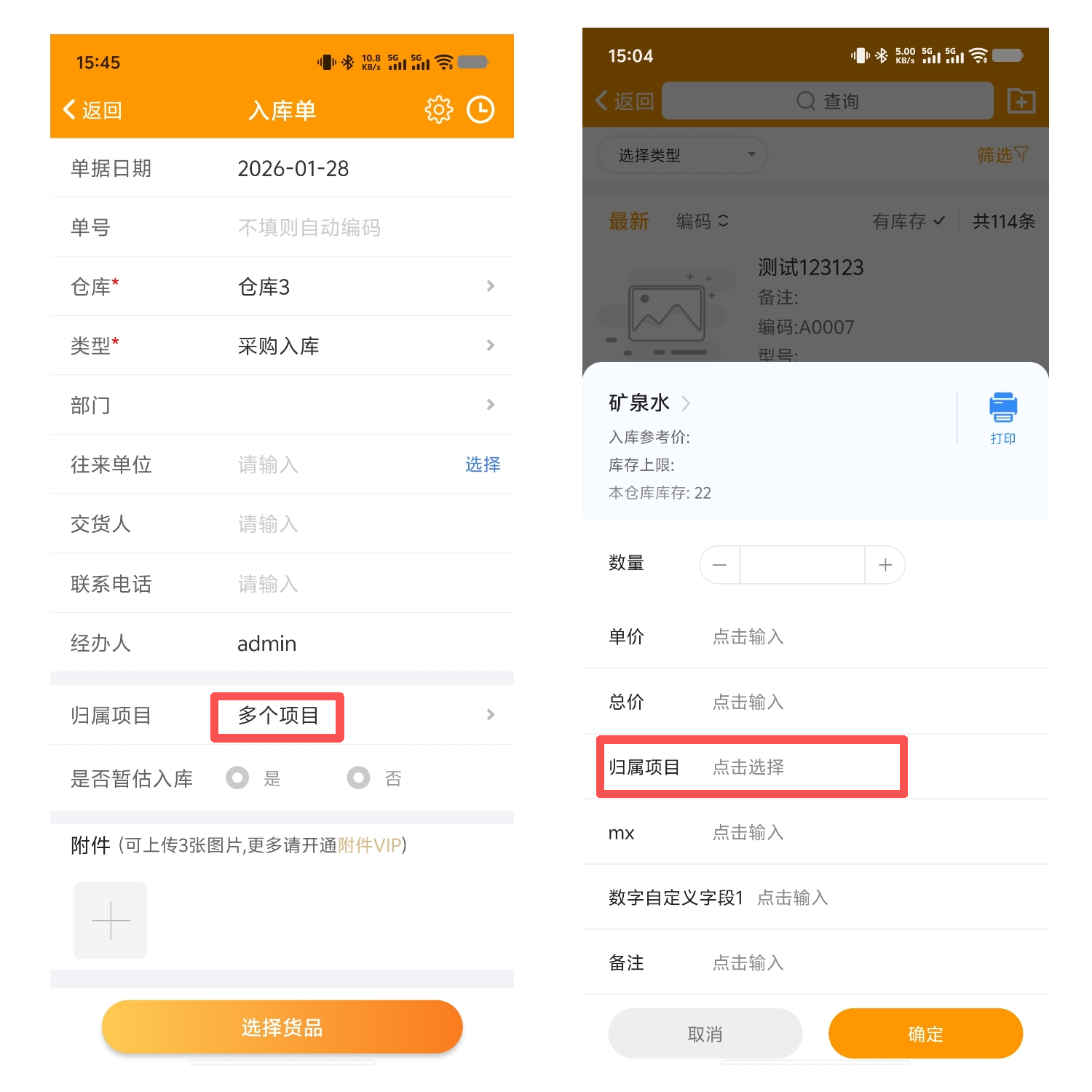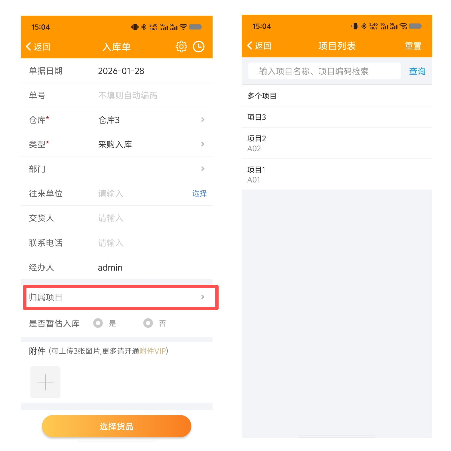 1.添加入库单,在【归属项目】位置点击选择项目,