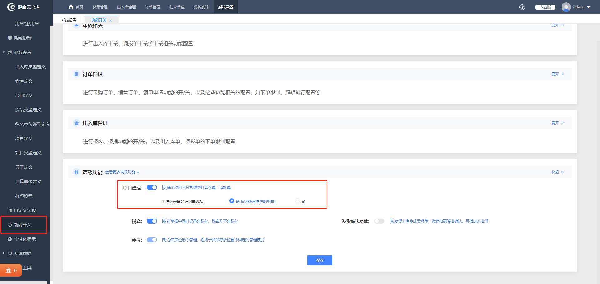 1、在系统设置-功能开关中开启项目管理功能。“出库时是否与入库项目关联”,如果选择“是”,表示在出库时会根据项目库存判断库存是否充足,如果库存不足会根据相应的规则做出提醒。反之,若项目库存不足不会做出提醒,只起到记录关联项目的作用。