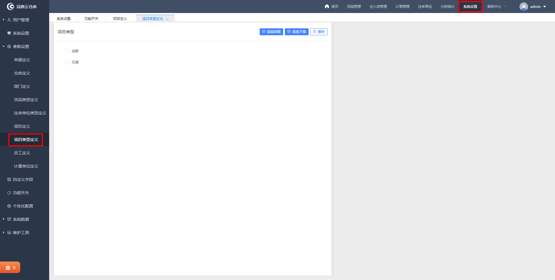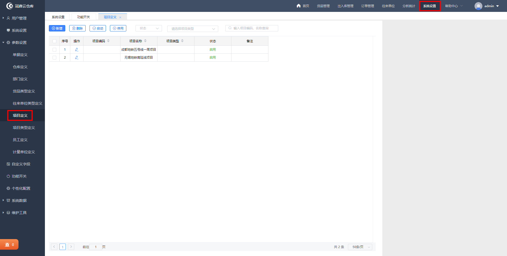 2、项目名称设置:在系统设置-参数设置-项目定义中可定义项目名称,并且在项目类型定义中可添加项目类型,实现分类/分级项目管理。(项目完成后可停用项目)