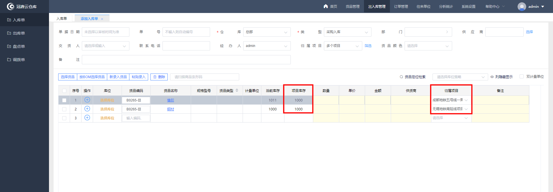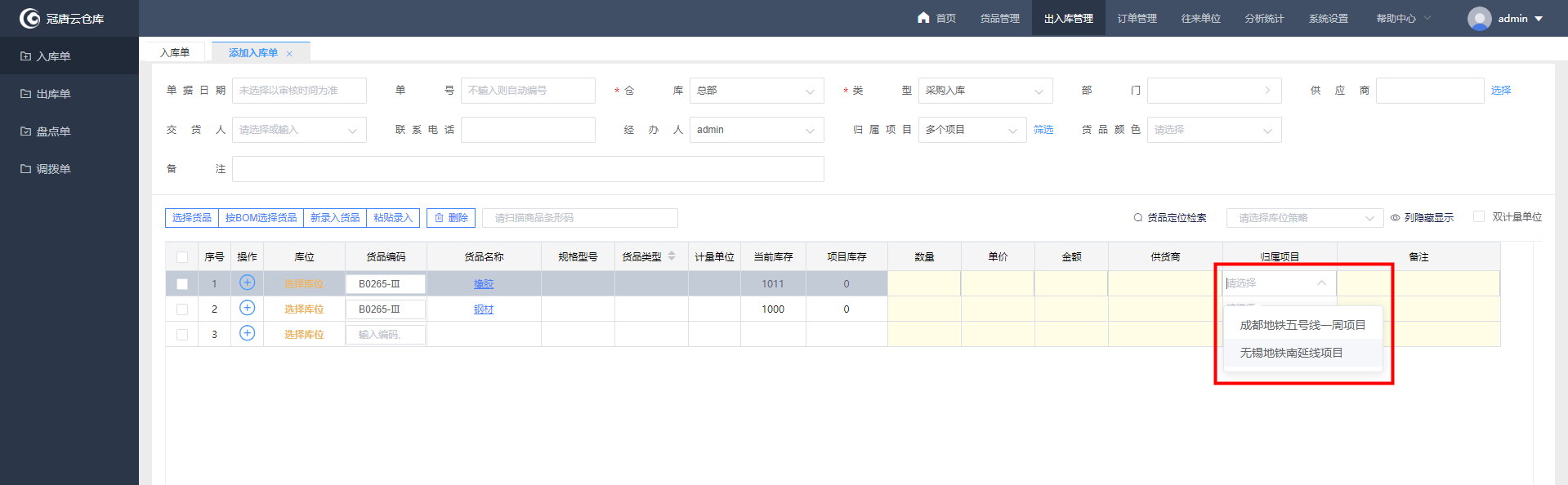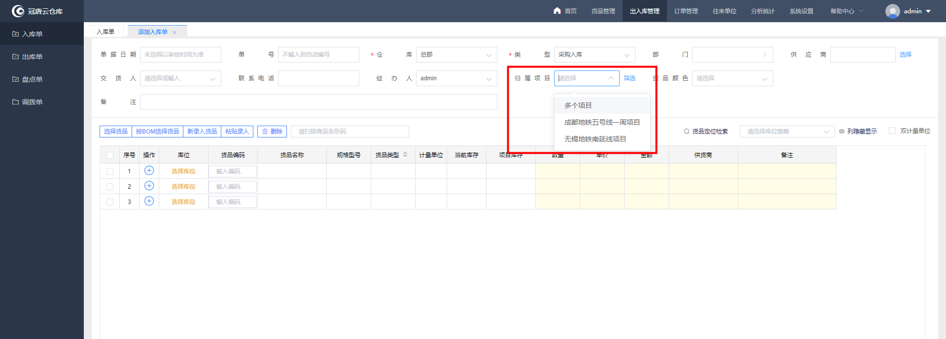 3、项目名称定义好后在添加单据时就可以选择项目,在单据主表-归属项目中直接选择项目名称,也可以通过项目类型分级筛选选择项目,项目关联的就是整笔单据的所有货品。如果主表中归属项目选择“多项目管理”,在单据货品明细中就会展示归属项目的字段,此时再针对单个货品选择项目。