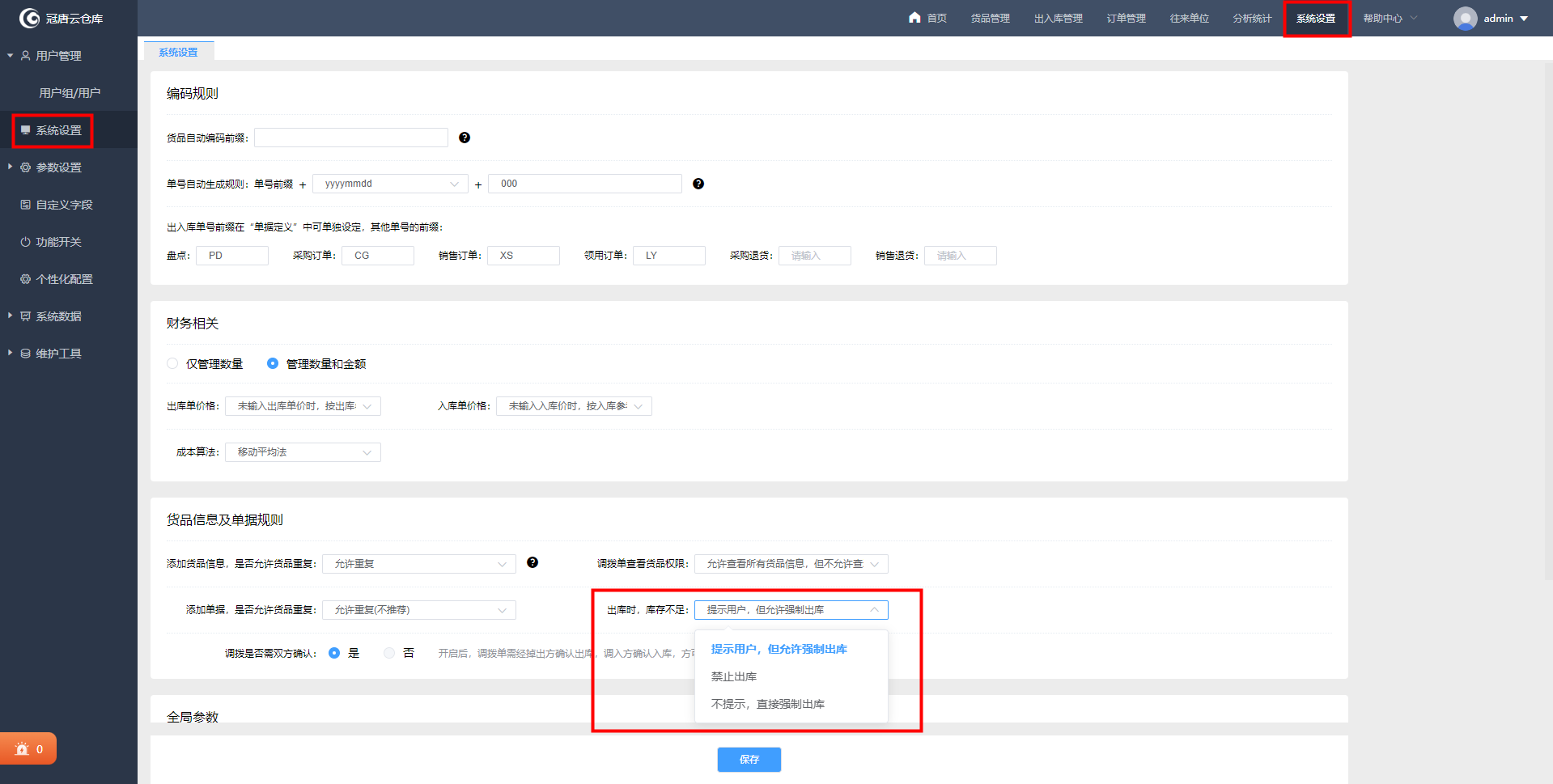 4、出库时,单个货品选择项目时只展示入过库的项目名称,同时会展示该项目的库存。如果出库的数量大于项目库存,会根据出库时库存不足的规则来判断是否允许出库。