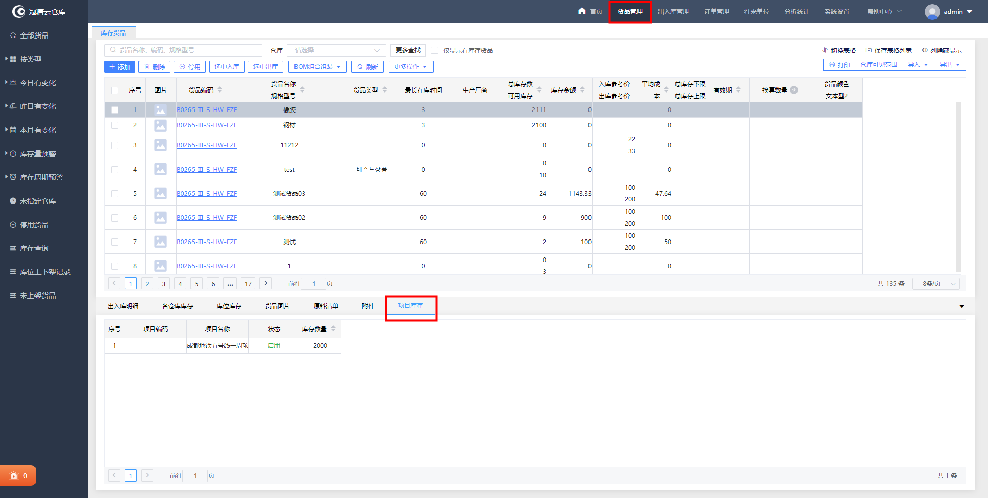 5、可在货品管理列表下面查询货品在每个项目上的项目库存。
