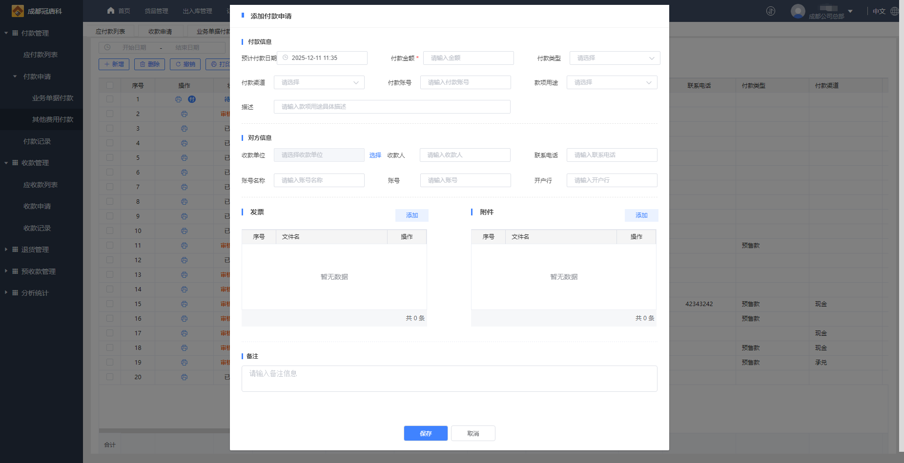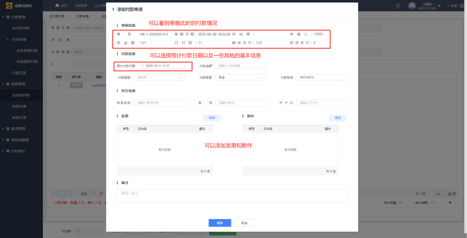 2、填写相关信息,添加付款申请