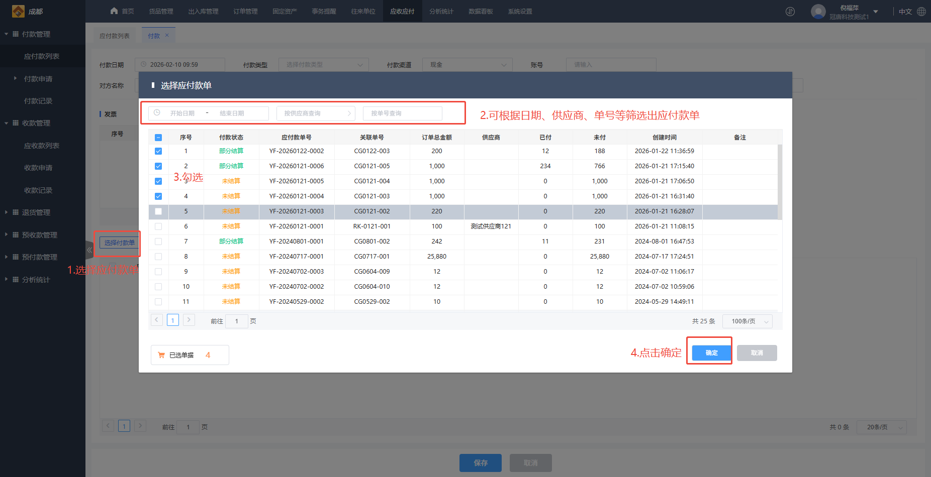 - 先选择应付款单,再自动分析每一笔的付款金额