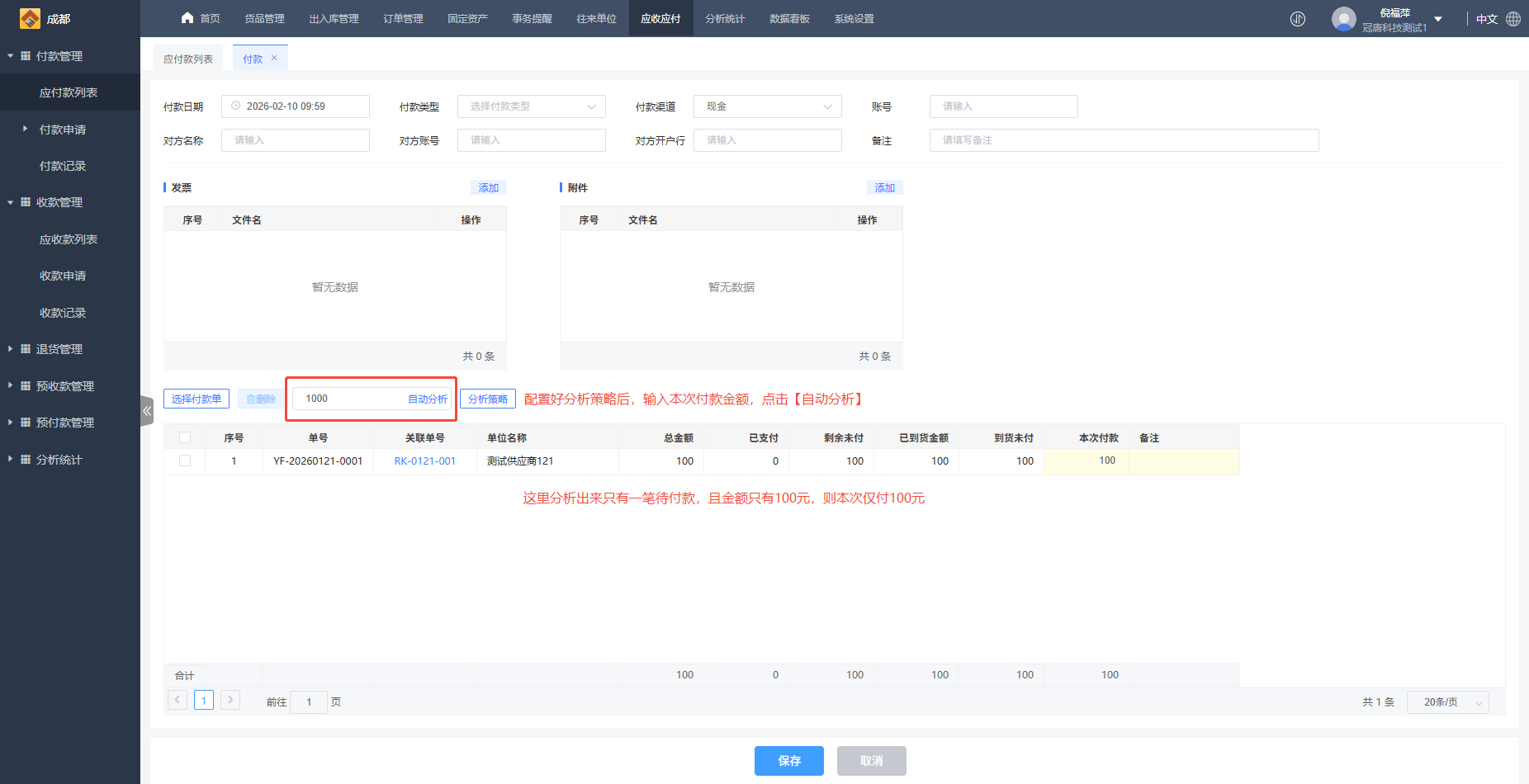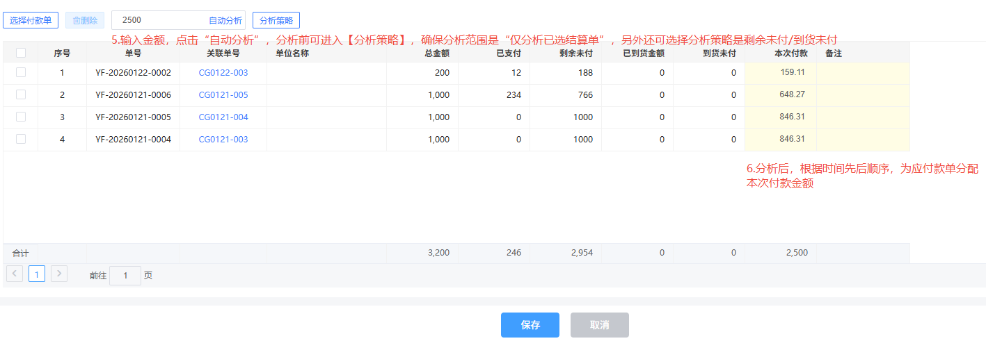 - 直接输入付款金额和供应商,自动分析该供应商所有应付款单,根据时间先后顺序,自动分配付款金额