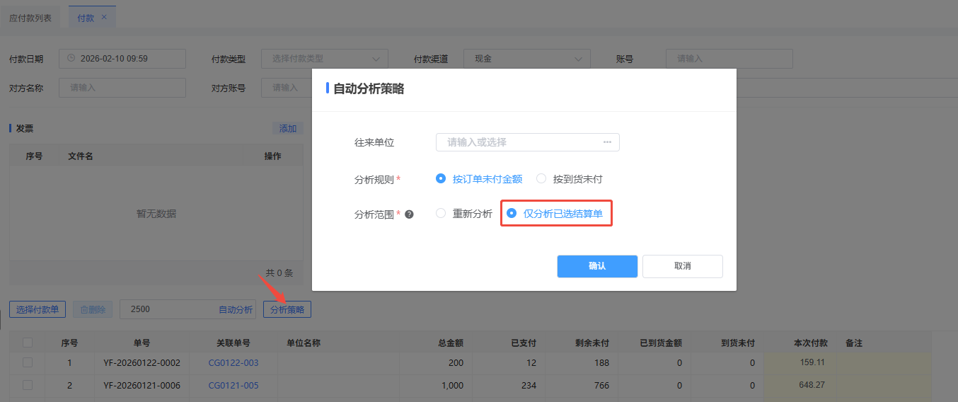 有两种自动分析操作方式,可根据实际付款需求进行: