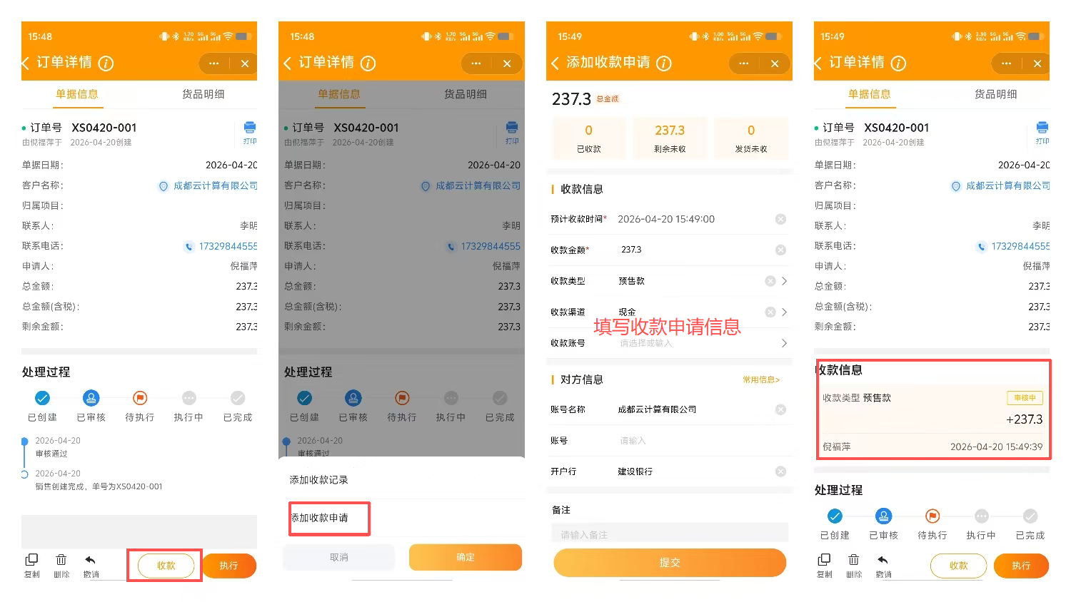 手机端支持收款申请的提交和查看