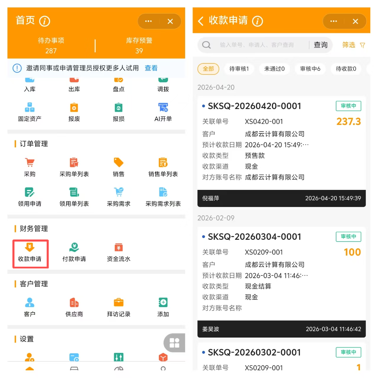 在首页-财务管理-收款申请中可以看到所有权限内可查看的收款申请。