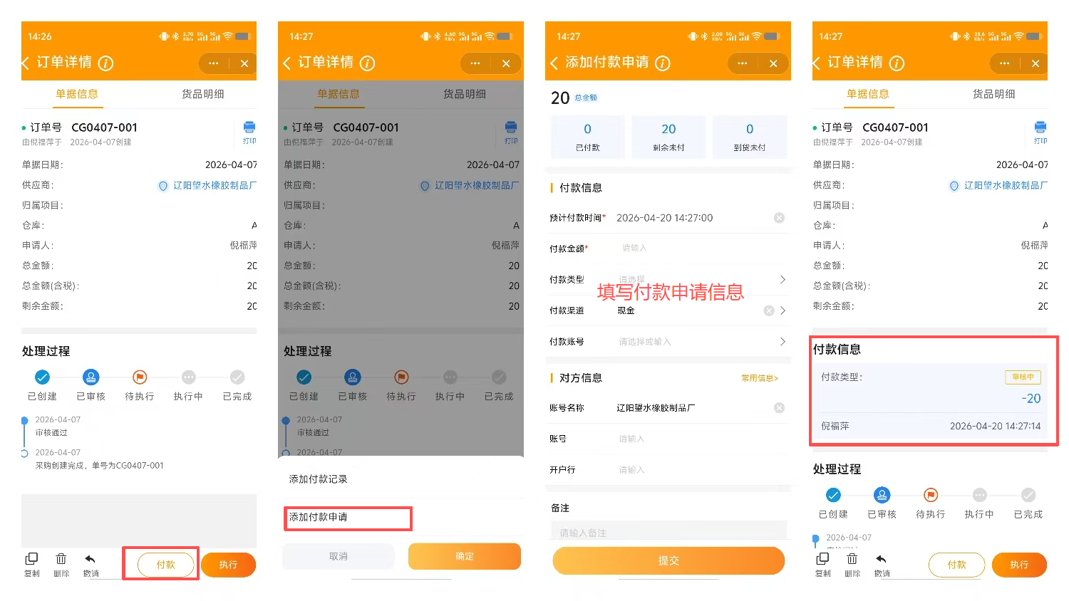 进入需添加付款申请的采购订单详情中,点击“付款”,选择“付款申请”,进入添加付款申请页面,填写金额、付款类型、渠道、附件等信息后提交,提交后在订单详情中可以看到付款信息