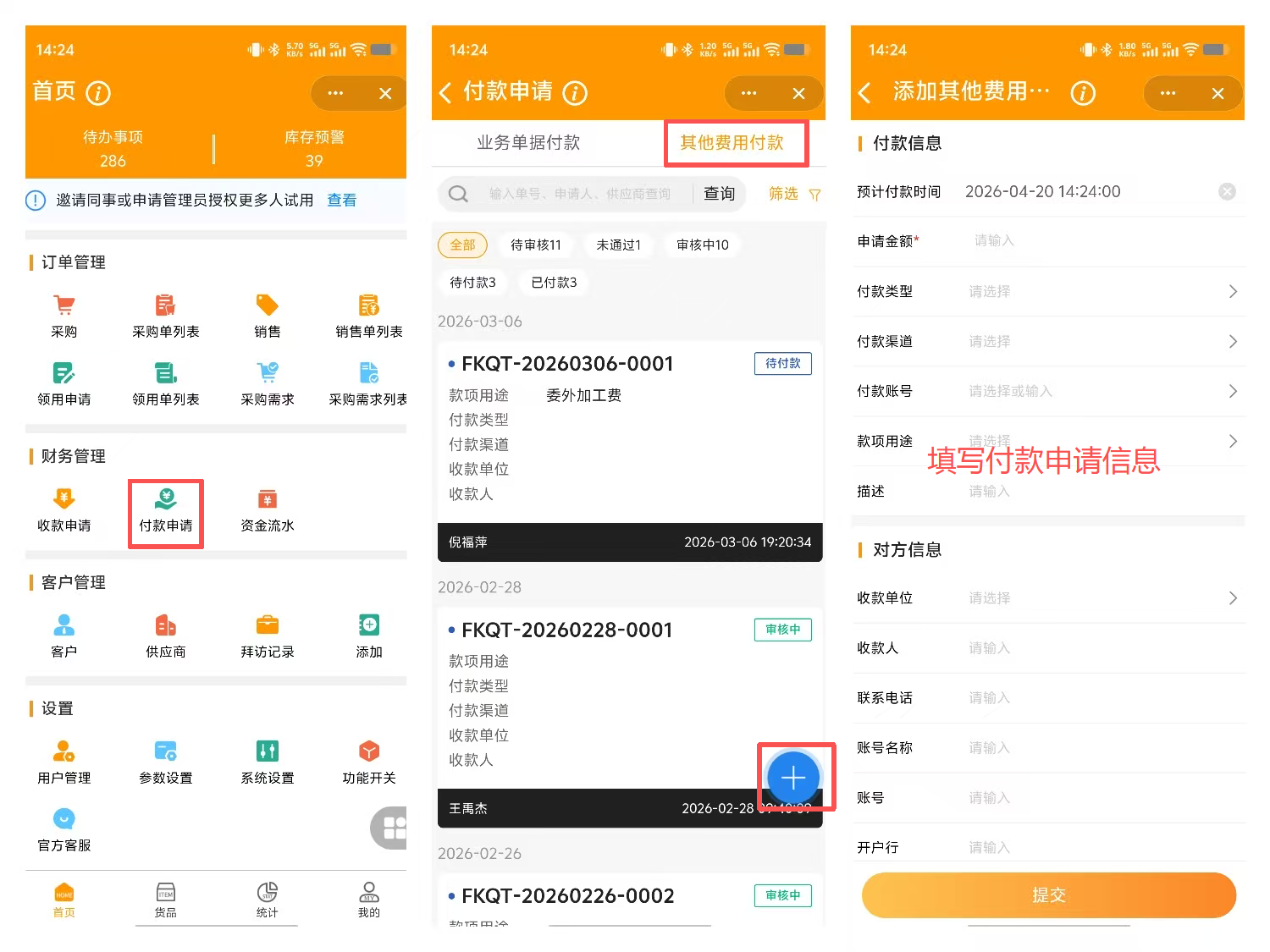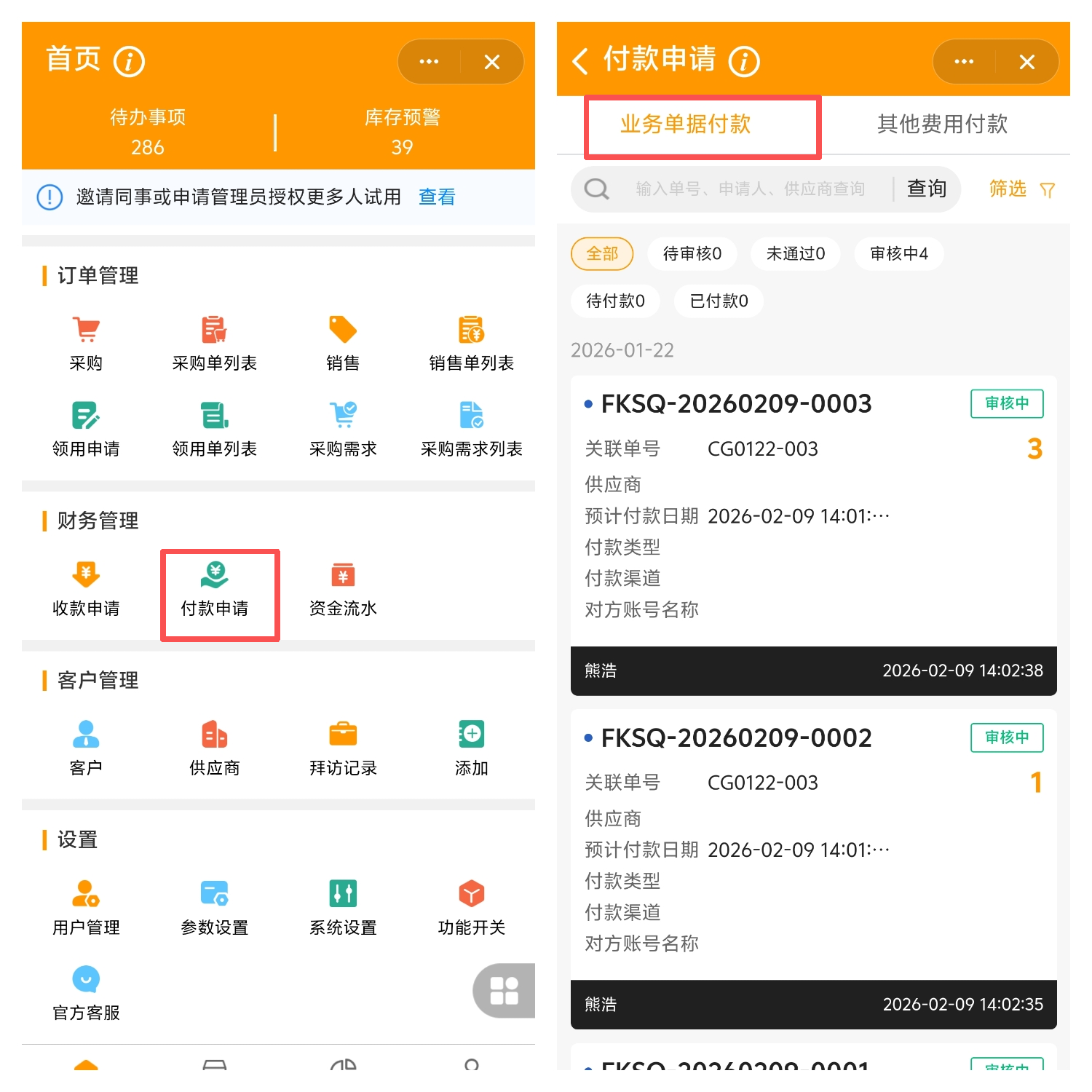 手机端支持查看和添加业务单据付款申请、其他费用付款申请。