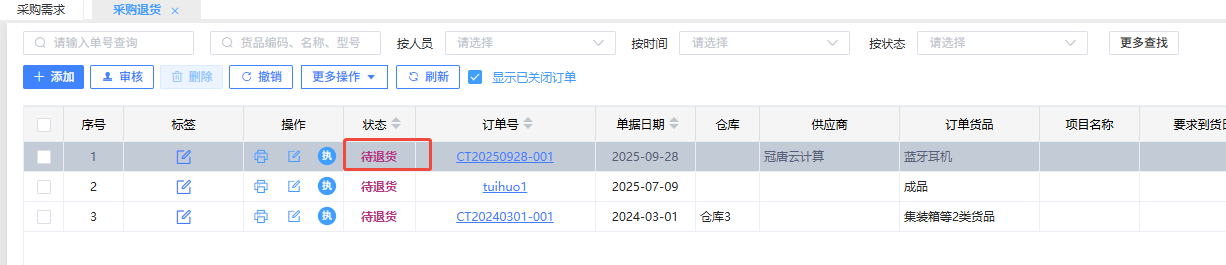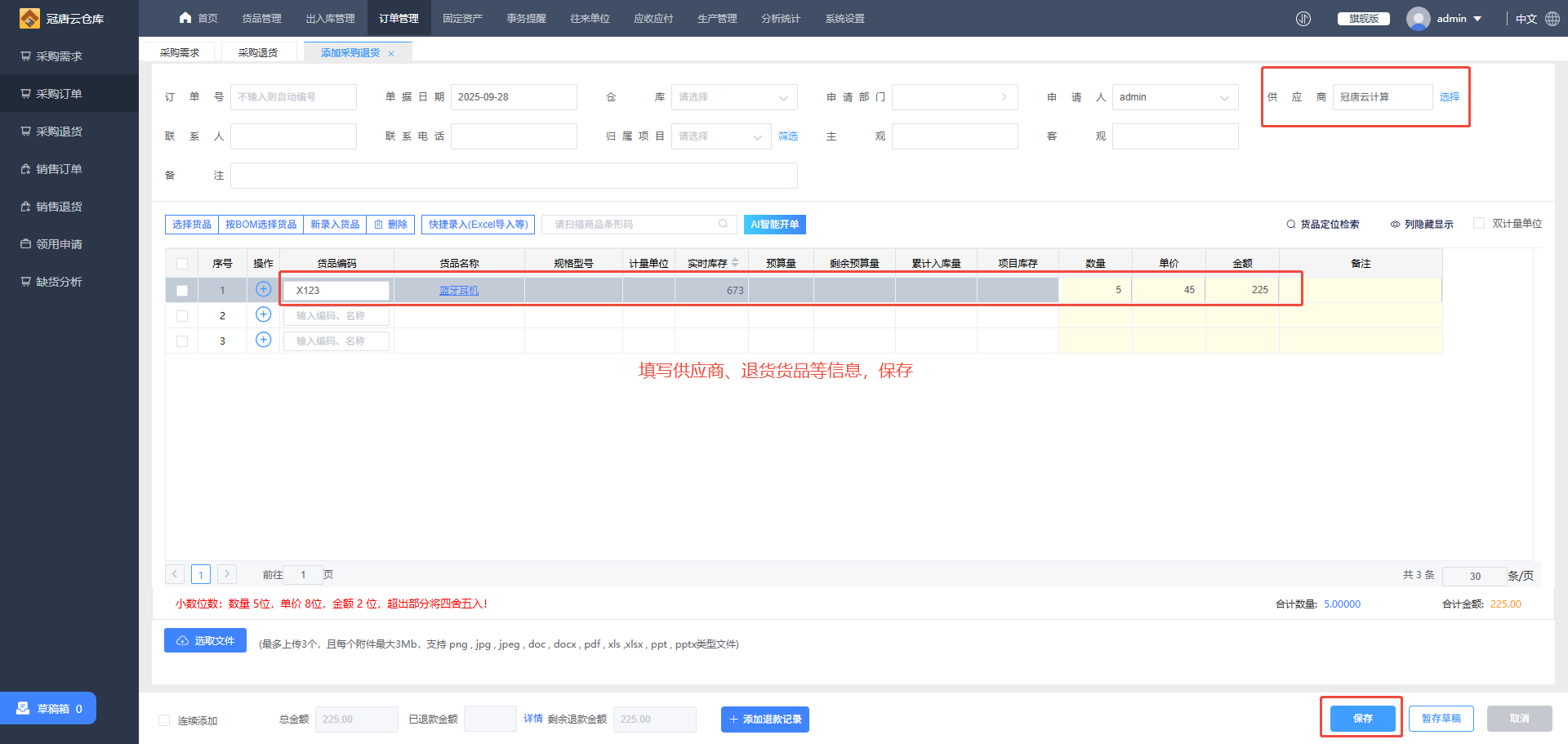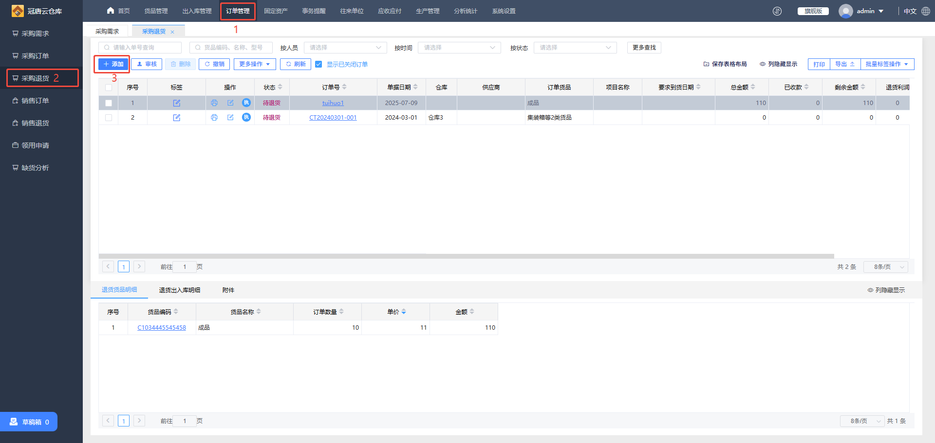 1.进入【订单管理-采购退货】,点击添加,录入一笔退货单(也可以在采购订单列表选中需退货的订单,点击退货)