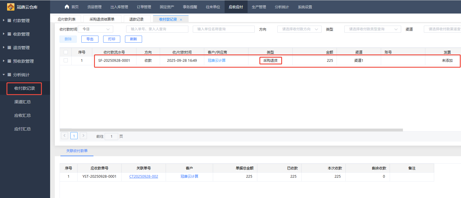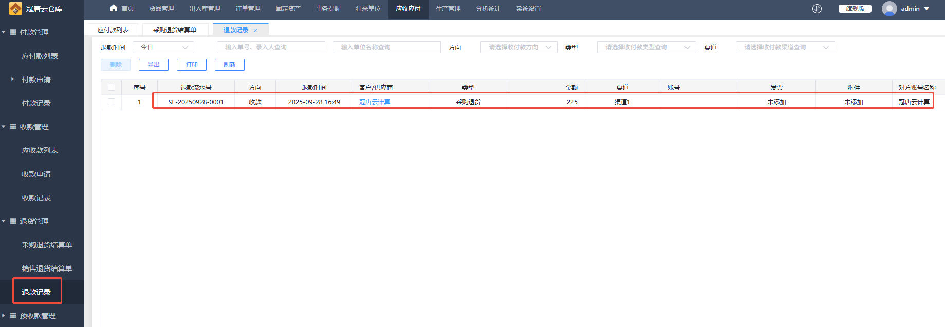 收付款记录中也可以看到这笔类型是采购退货的退款记录