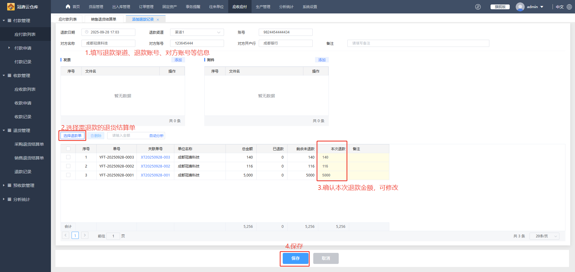 填写退款渠道、账号以及对方信息,选择需退款的退货结算单,再确认本次退款金额,确认无误后保存