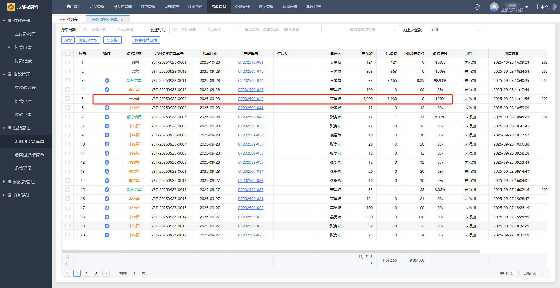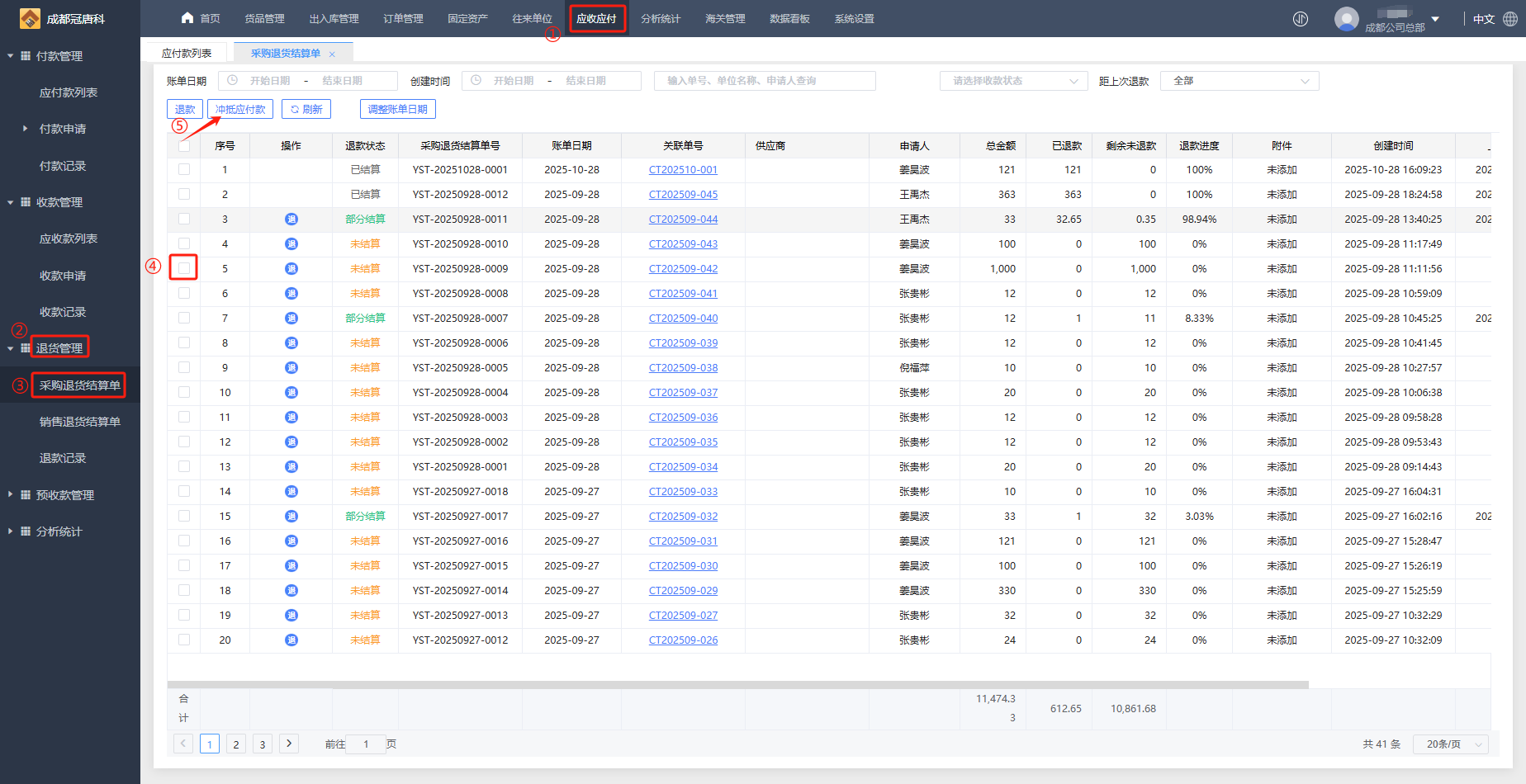 1、在应收应付-退货管理-采购退货结算单 勾选未结算单据,点击“冲抵应付款”按钮