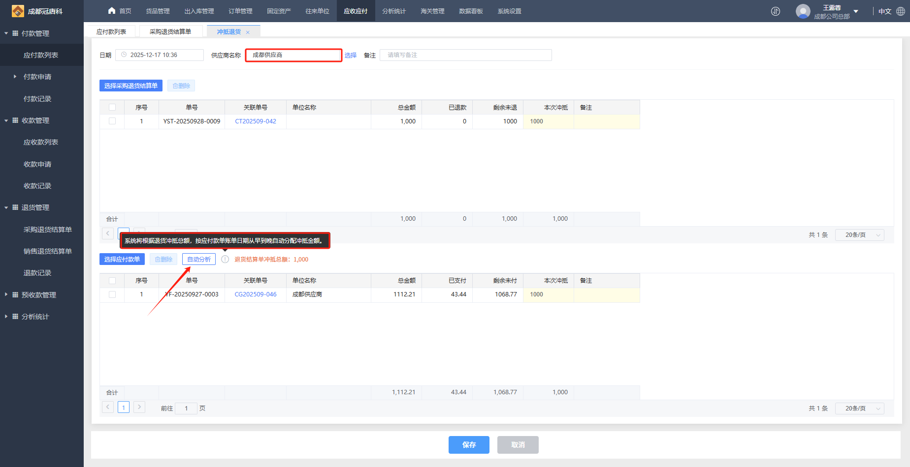 2、选择对应供应商,点击下方自动分析,系统将根据退货冲抵总额,按应付款单账单日期从早到晚自动分配中抵金额;也可以点击左侧“选择应付款单”按钮自行调整