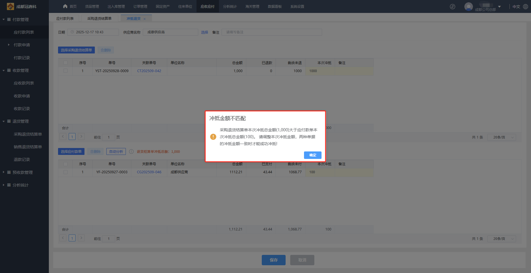 3、注意:冲抵总金额大于应付款单本次冲抵总金额时,两种单据的冲抵金额需一致