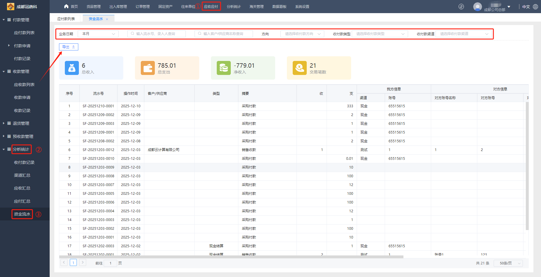 1、在应收应付-分析统计-资金流水,筛选各个条件查询资金流水,可直观的查看在相应条件下的总收入,总支出,净收入,交易笔数等,查询结果可导出