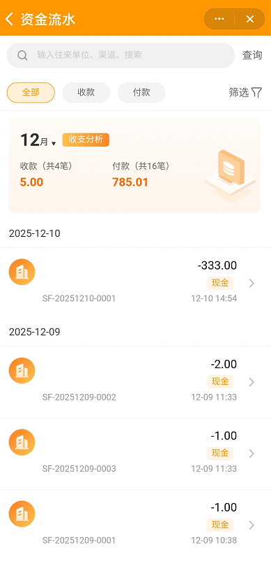 可以看到资金每一笔资金流水以及收付款汇总,点击对应的流水可以进入收付款记录详情