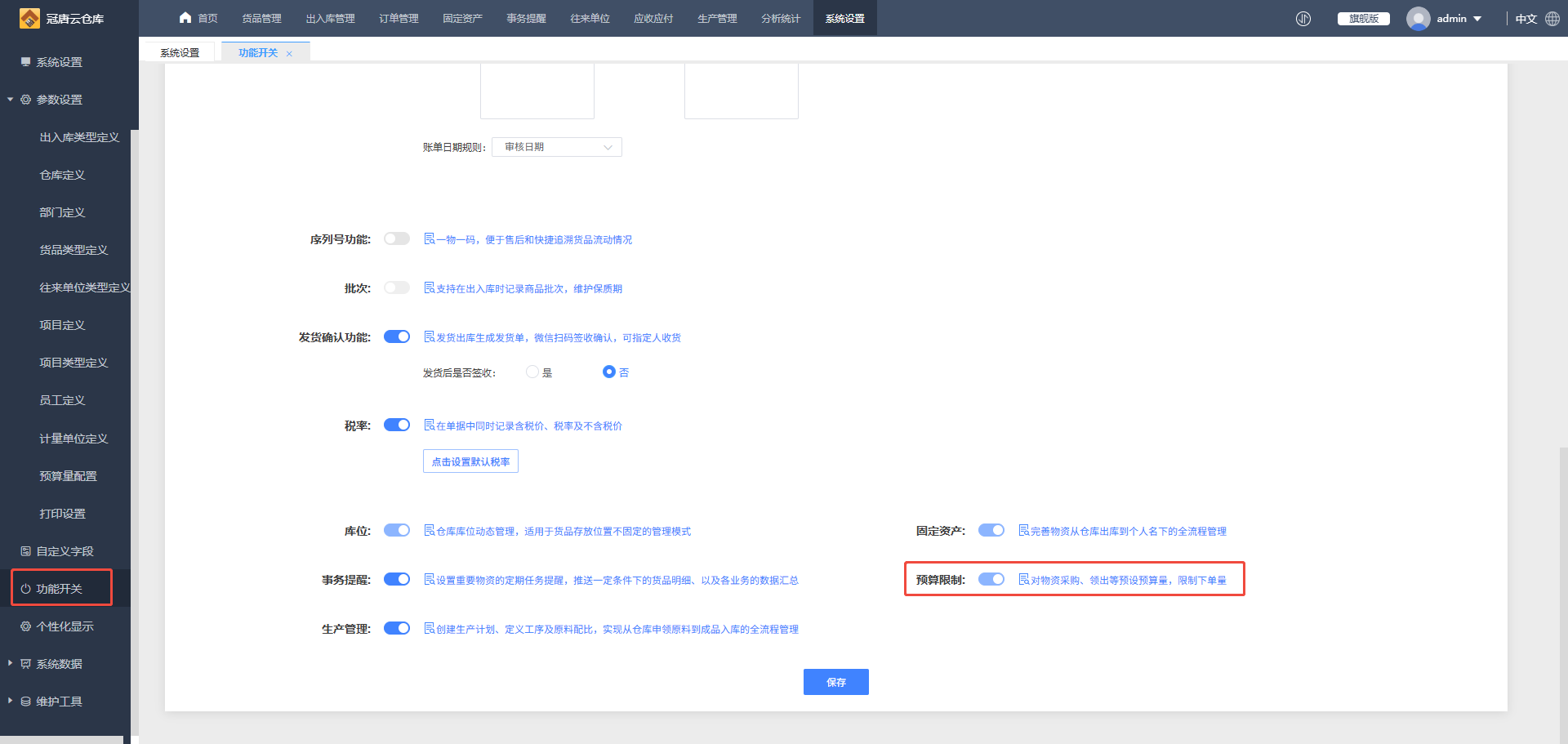 1、进入【系统设置】-【功能开关】页面,在高级功能中开启预算限制功能。