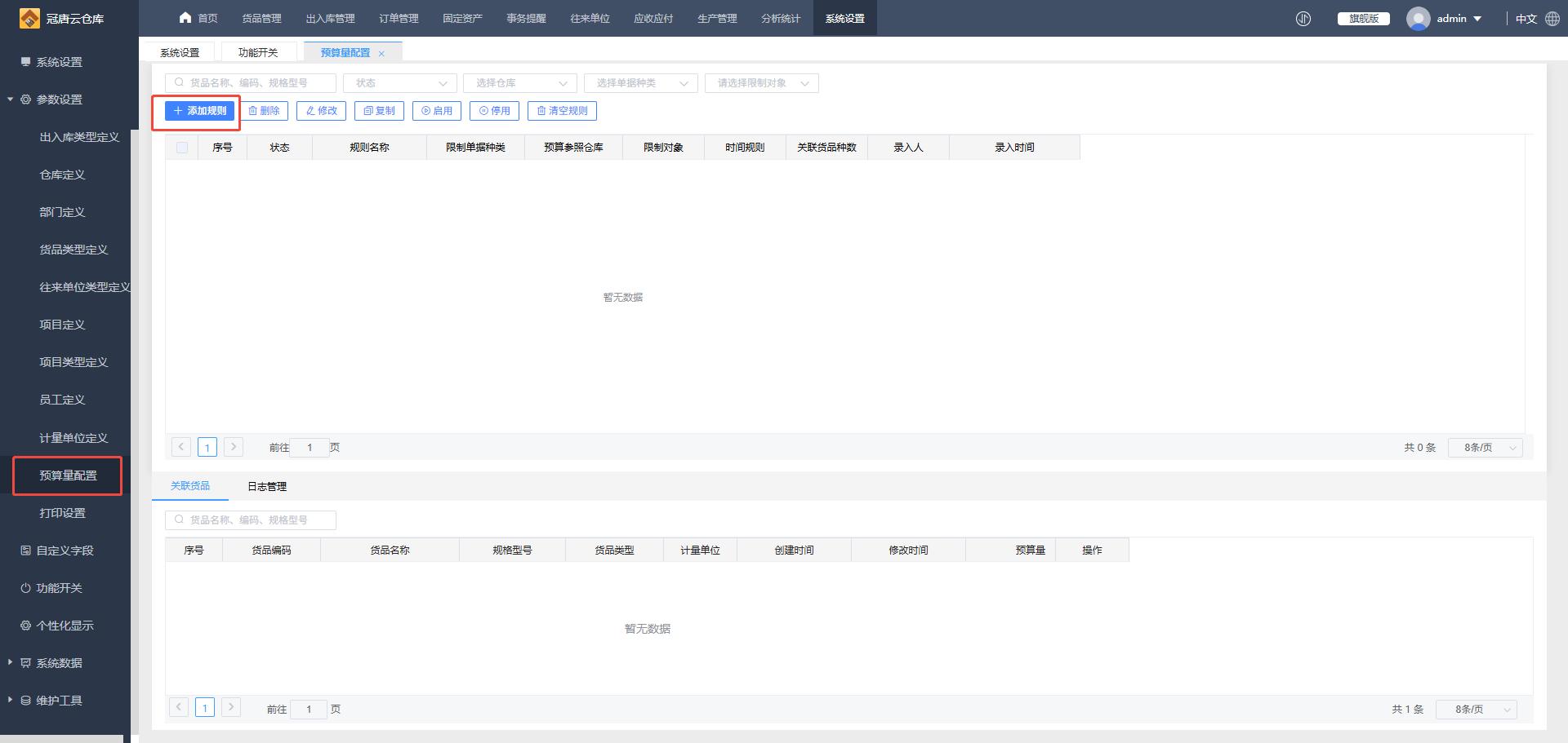 2、开启后刷新页面,参数设置下出现【预算量配置】一栏,说明功能已经成功激活了,接下来点击【添加规则】设置预算限制规则。