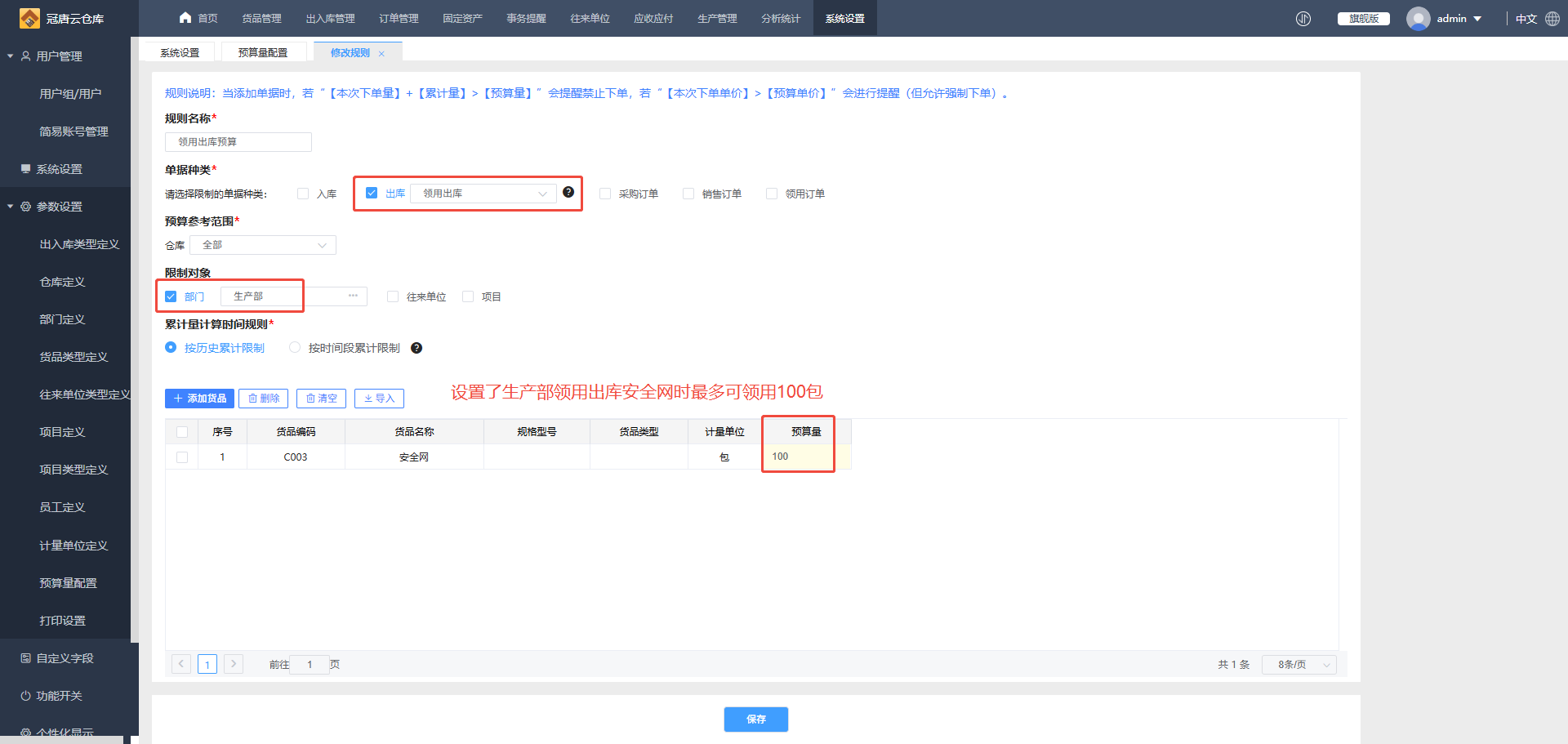 - 累计量计算时间规则:对所选时间段,或是累计时间是统计出入库量的方式进行预算量控制,其中若按时间段进行预算量控制,剩余预算量将会根据所选时间进行周期性更新