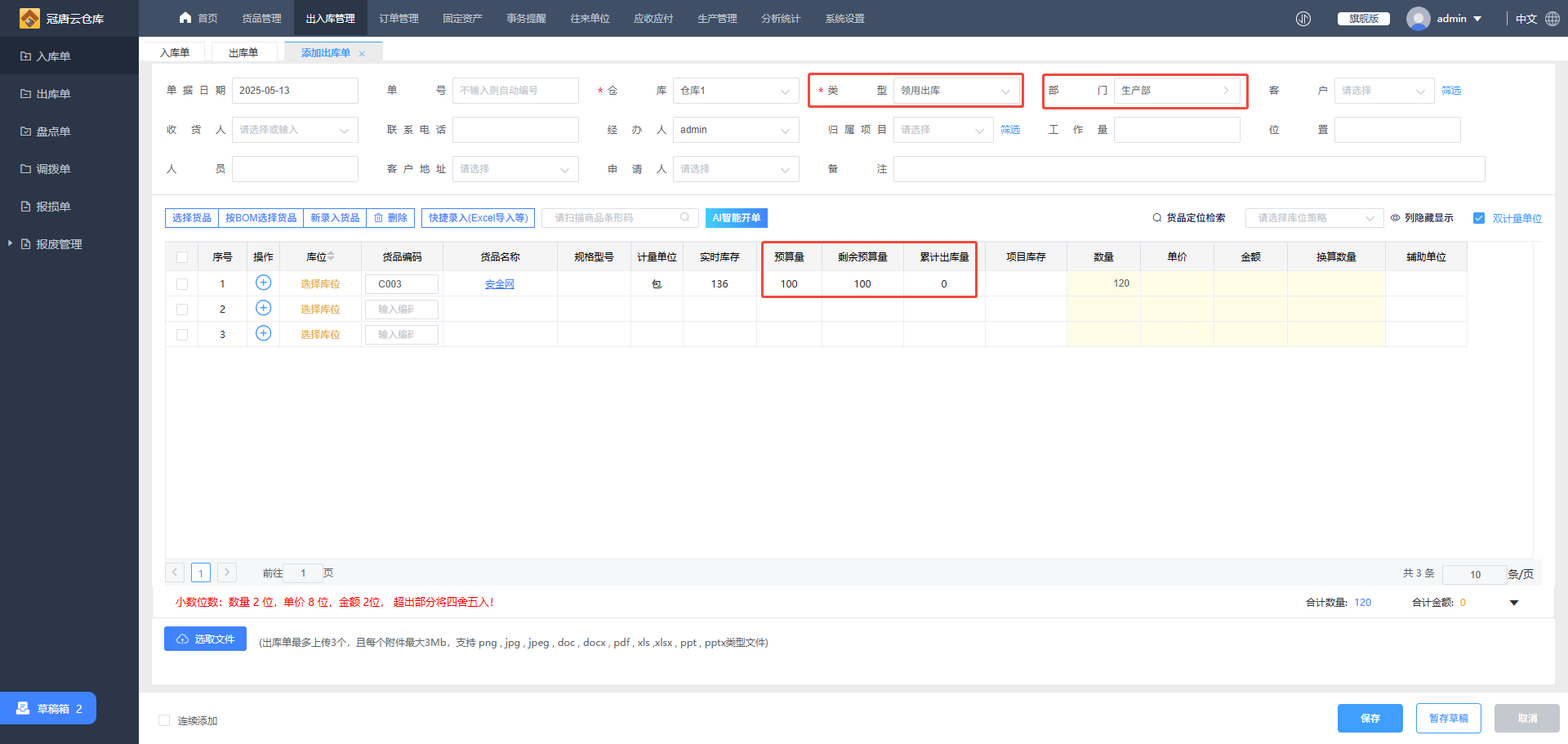 3、进入出库单添加页面,如果选择的单据信息符合我们设置的规则,将会展示出预算量、截止目前累计的出入库量及剩余预算量,通过剩余预算量可以预判我们可以采购或领用多少物料
