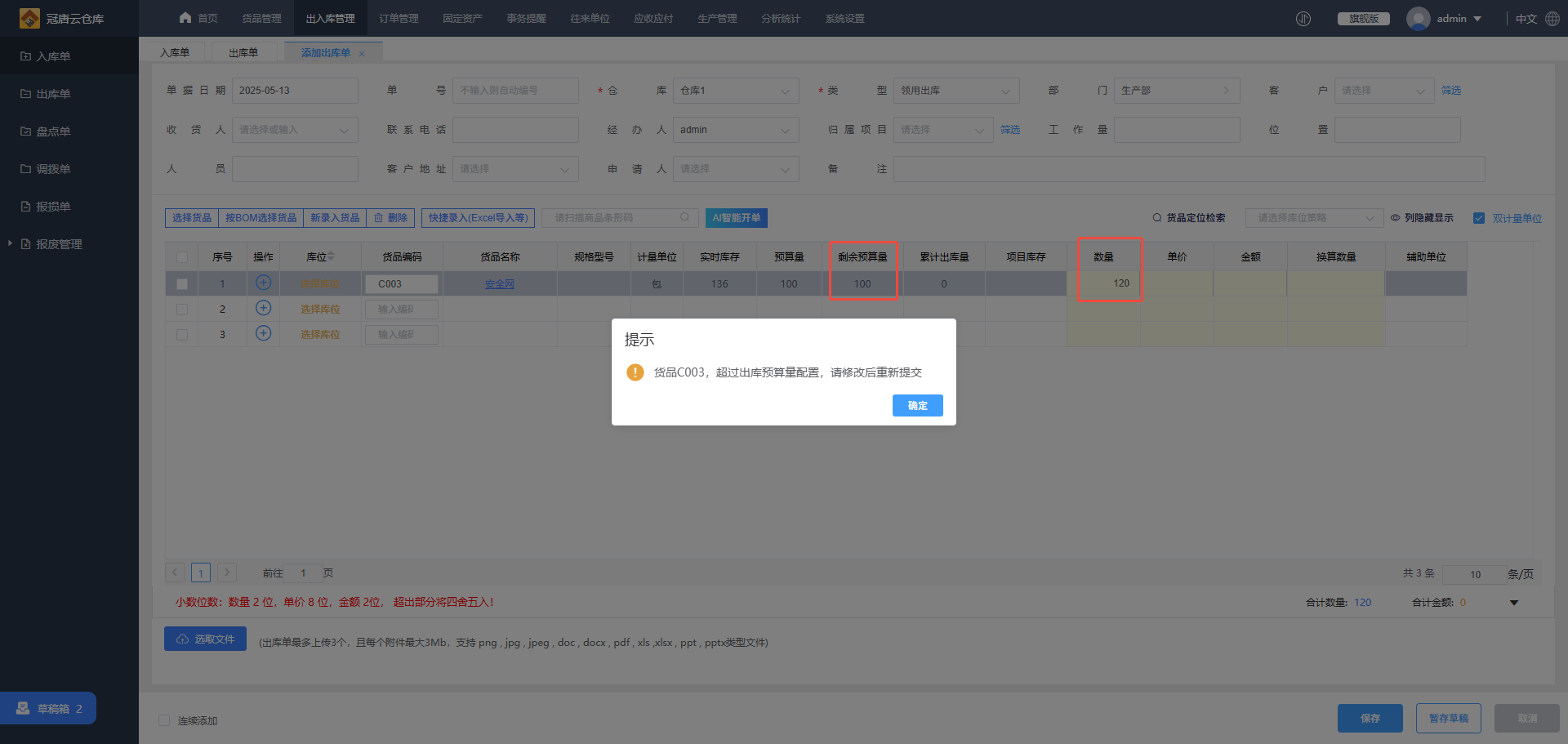 4、【展示效果】如果输入的数量超过剩余预算量,那么系统会给出提示禁止出库