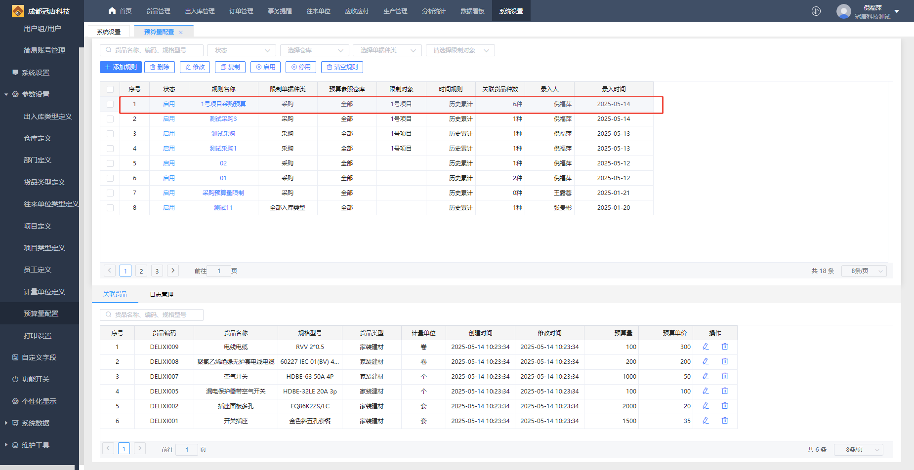3.保存后在预算规则列表中可以看到这条规则,这条规则将会在采购需求阶段控制预算量(采购订单阶段也会再次控制,但一般情况下不会超),采购需求转采购订单阶段控制预算价格。