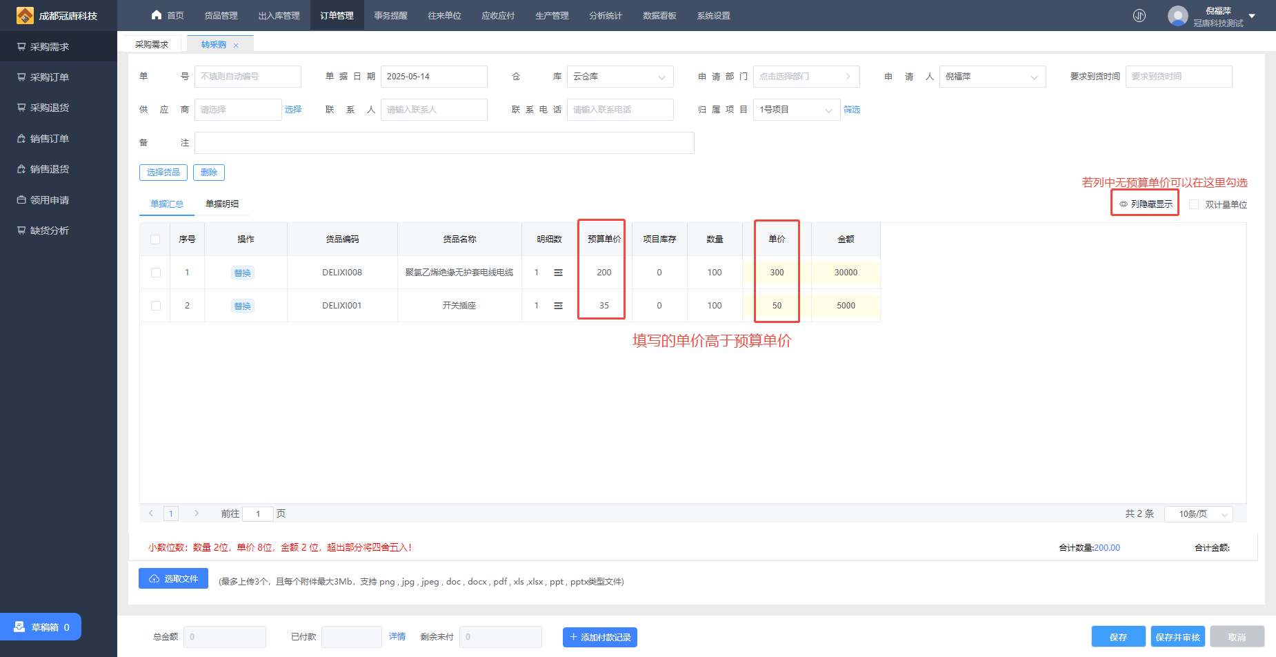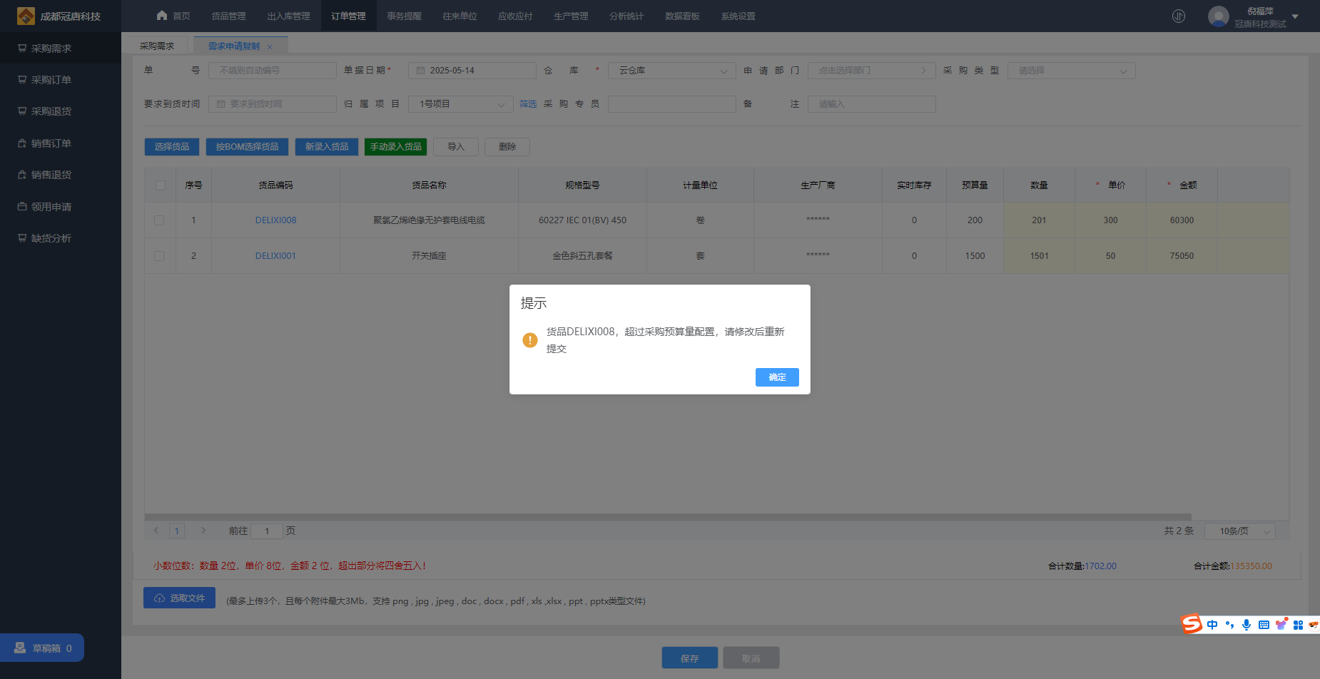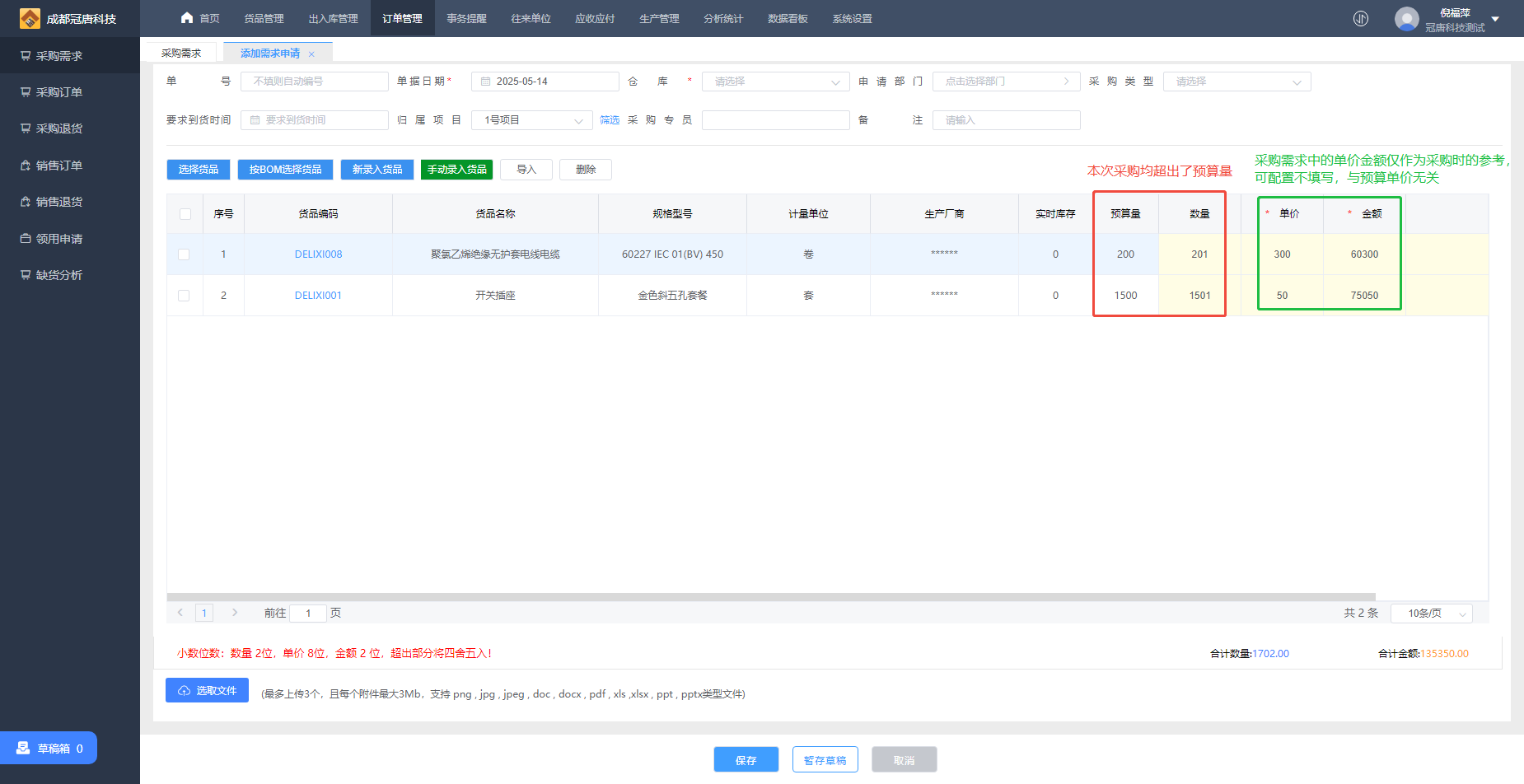 4.进入【订单管理】-【采购需求】,添加采购需求,我这里选择了两个刚才规则中的两个物料,填写的需求数量均高于预算量。注意这里的单价金额仅作为转采购时的参考,可配置不填写,与预算单价无关