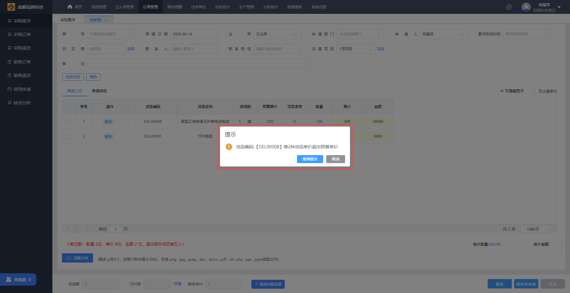 5.提交单据时会提示超出了预算量,这里我修改采购数量后提交采购需求(采购数量均改为100)。