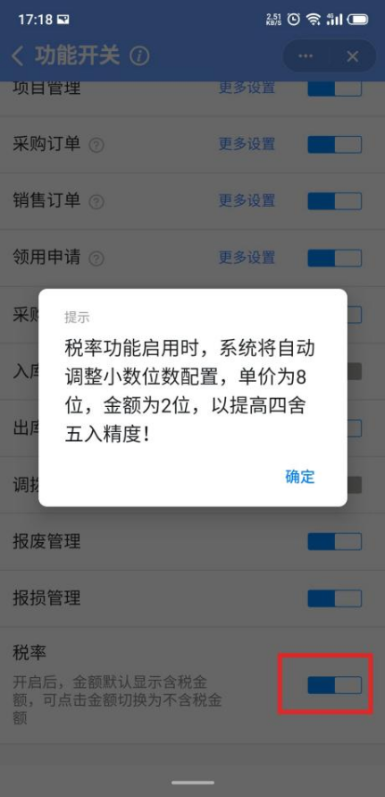 提示:“税率功能启用时,系统将自动调整小数位数配置,单价为8位,金额为2位,以提高四舍五入精度!”