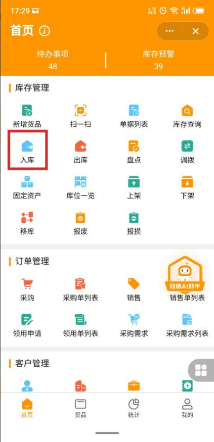 ①在“首页”→“库存管理”点击“入库”,“添加”入库单。