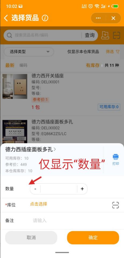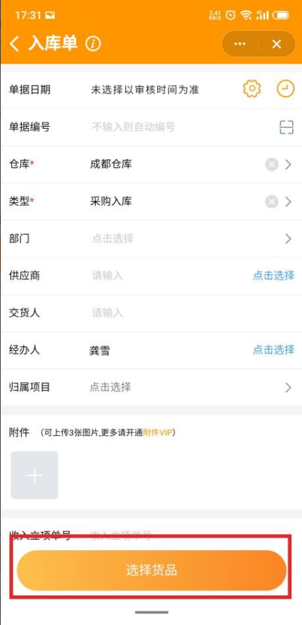 ②完善单据主表信息,点击“选择货品”,进入“选择货品”页面。