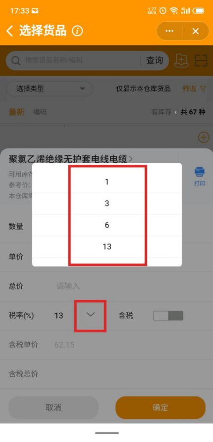 ③点击需要入库的货品,在弹框中,点击税率“下拉”图标,可以看到,默认税率值可选择。“1%”,“3%”,“6%”和“13%”这四个常规税点。