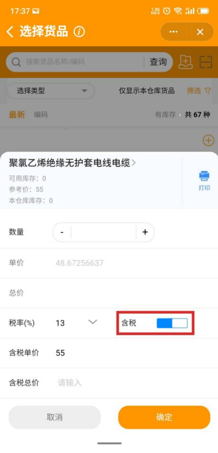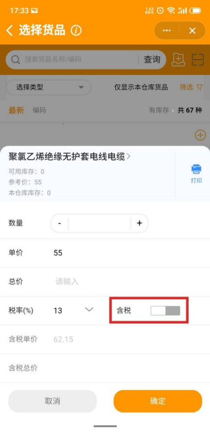 ⑤添加入库单时,开启“含税”按钮,通过输入“含税单价”和“含税金额”去按“税率”与“数量”计算“不含税”的“单价”和“金额”。