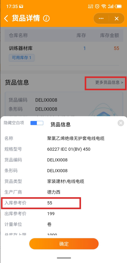 注意:此时若货品信息中提前设置好“入库参考价”,则“含税单价”自动带出“入库参考价”参与计算。