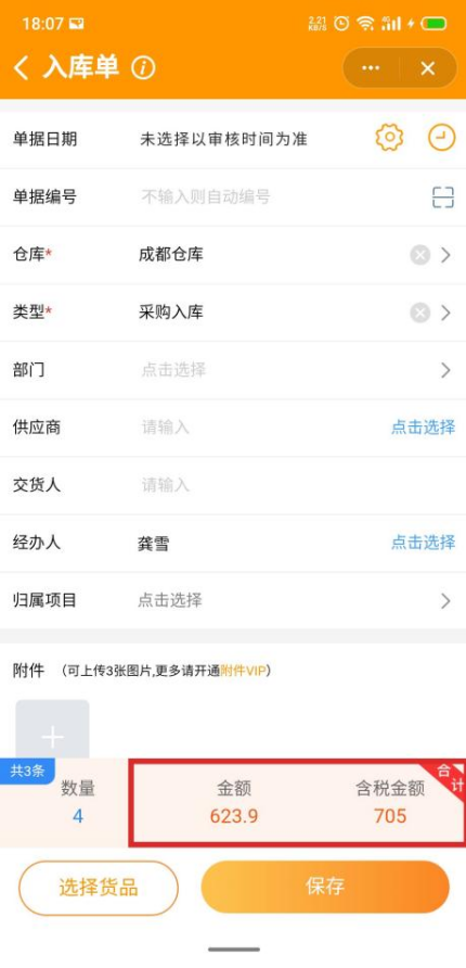 ⑦选择货品完成后,可在单据主表信息中查看“金额”和“含税金额”,点击“保存”,入库单添加成功。