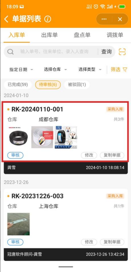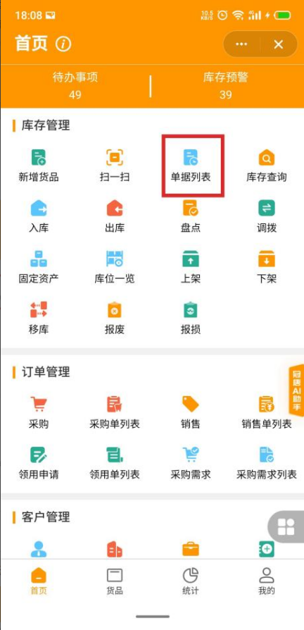 ⑧回到“首页”→“库存管理”,进入“单据列表”中,查看刚添加好的“入库单”。